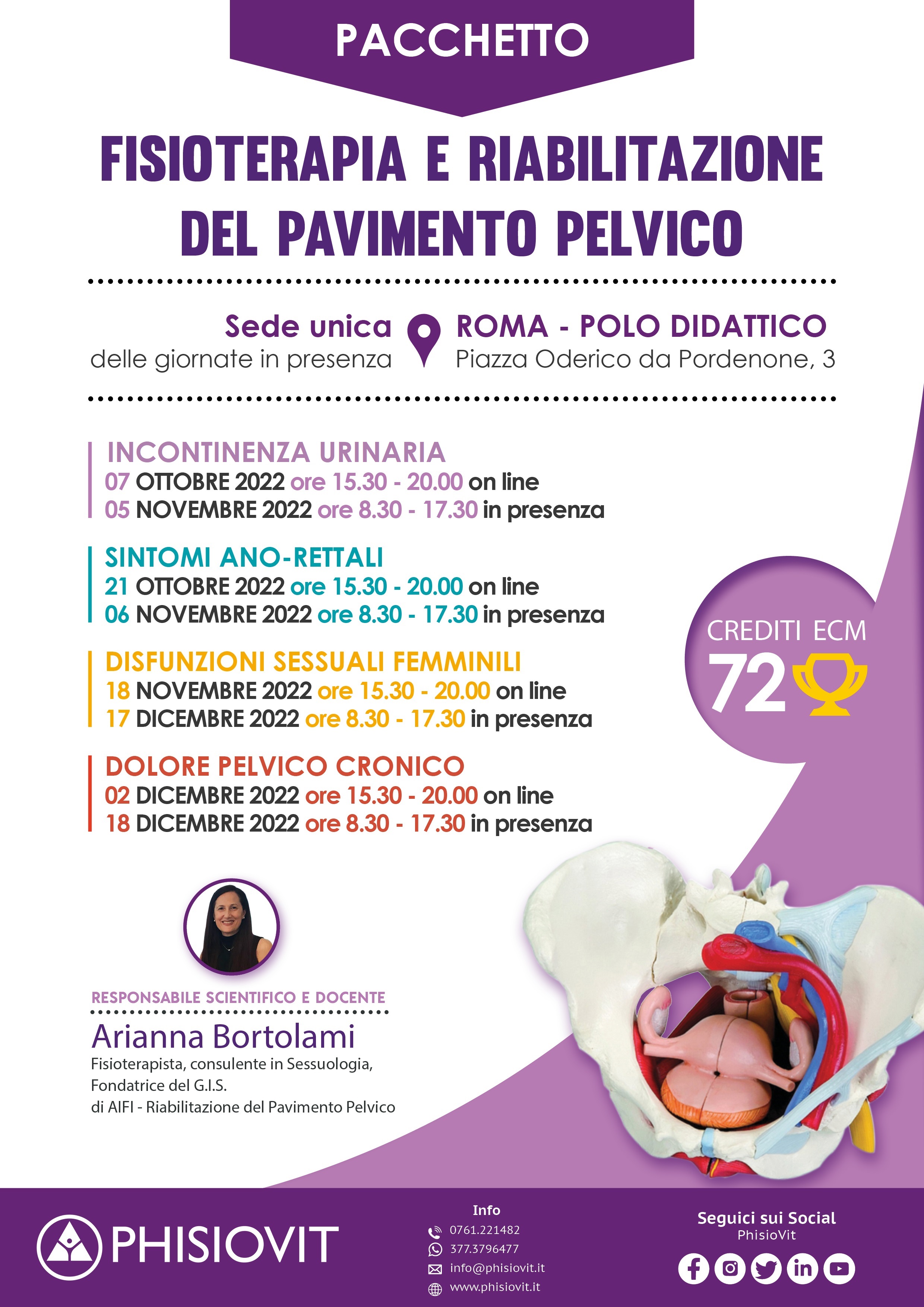 Esperto in Fisioterapia e Riabilitazione del Pavimento Pelvico edizione blended è un progetto didattico che mira a formare i professionisti dell'area riabilitativa e rieducativa nella fisioterapia e nella riabilitazione delle patologie che colpiscono il pavimento pelvico, include un pacchetto promozionale di quattro corsi ed eroga complessivamente 72 crediti ECM. I quattro eventi inclusi sono: "Fisioterapia e Riabilitazione del Pavimento Pelvico per l'Incontinenza Urinaria Femminile e Maschile", 18 crediti ECM, venerdì 7 ottobre 2022 ore 15.30 - 20.00 on line e sabato 5 novembre 2022 ore 8.30 - 17.30 in presenza a Roma; "Fisioterapia e Riabilitazione del Pavimento Pelvico per i sintomi ano-rettali", 18 crediti ECM, venerdì 21 ottobre 2022 ore 15.30 - 20.00 on line e domenica 6 novembre ore 8.30 - 17.30 in presenza a Roma; "Fisioterapia e Riabilitazione del Pavimento Pelvico per le disfunzioni sessuali femminili", 18 crediti ECM, venerdì 18 novembre ore 15.30 - 20.00 on line e sabato 17 dicembre ore 8.30 - 17.30 in presenza a Roma; "Fisioterapia e Riabilitazione nella sindrome del dolore pelvico cronico", 18 crediti ECM, venerdì 2 dicembre ore 15.30 - 20.00 on line e domenica 18 dicembre ore 8.30 - 17.30 in presenza a Roma.