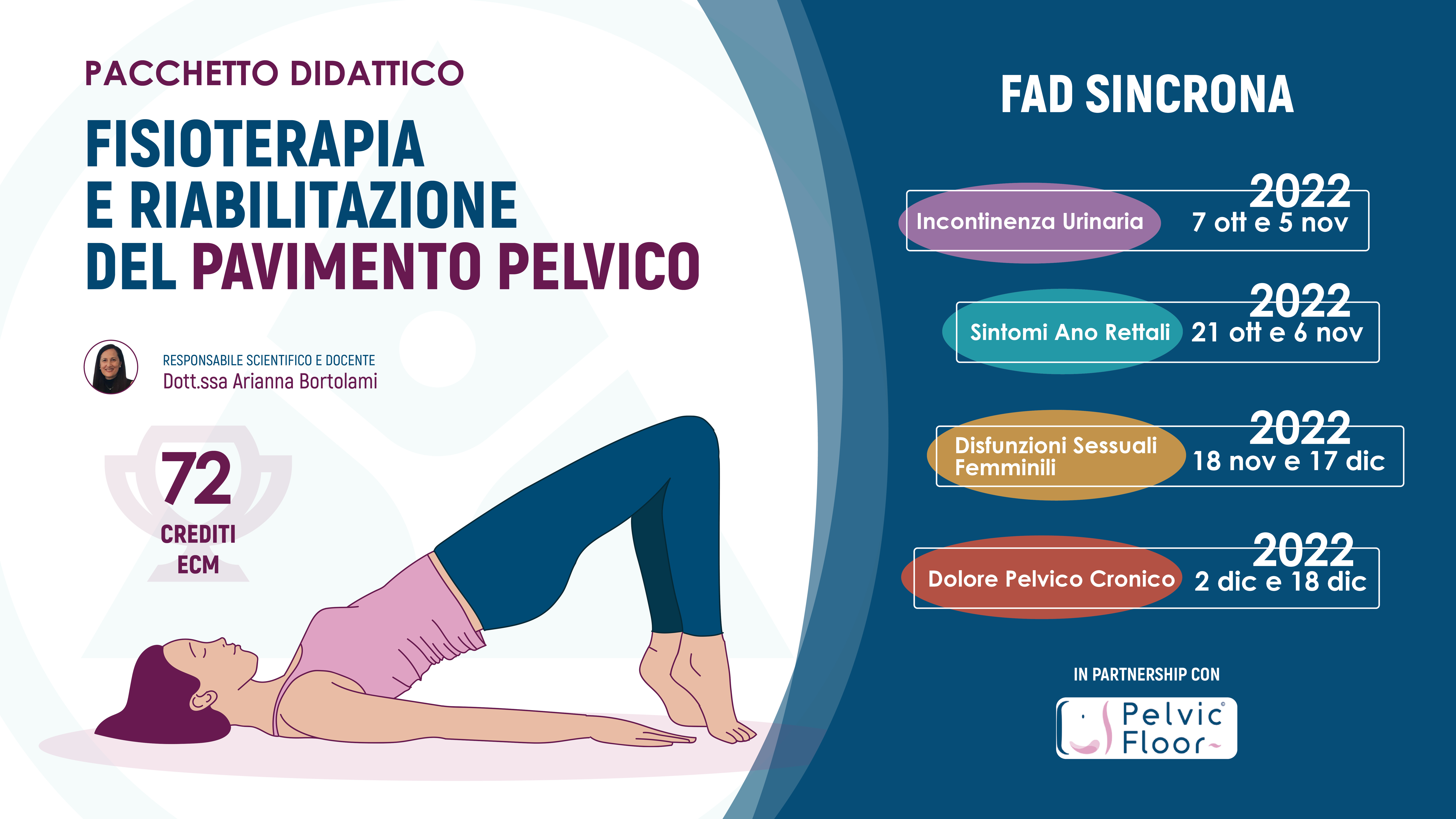 - Fisioterapia e Riabilitazione del Pavimento Pelvico per le Disfunzioni Sessuali Femminili corso FAD e-Learning - Dott.ssa Arianna Bortolami - in diretta venerdì 18 novembre dalle 15.30 alle 20.00 e sabato 17 dicembre dalle 8.30 alle 17.30 - ECM: 18
