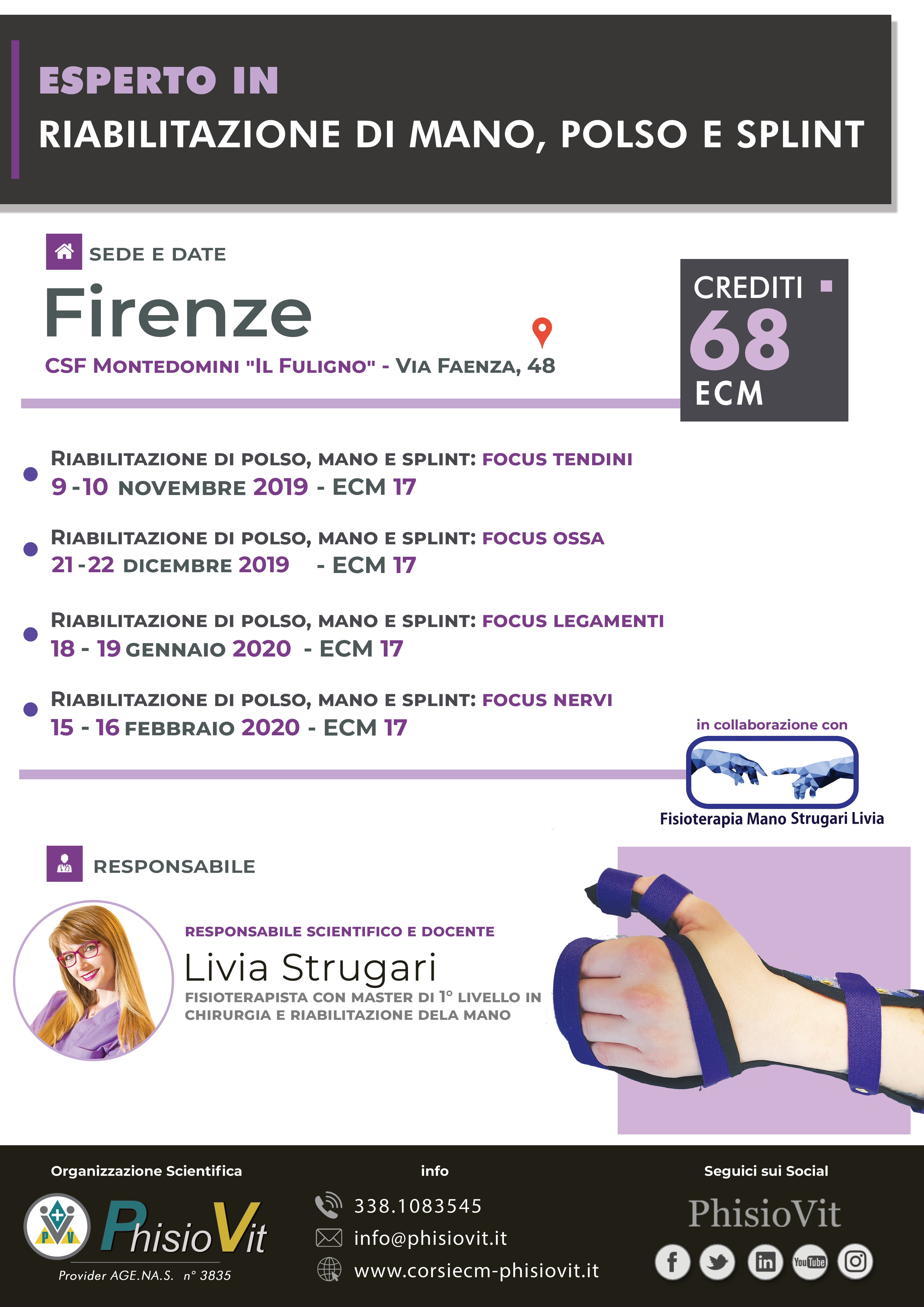 Esperto in Riabilitazione di Mano, Polso e Splint è un progetto didattico che mira a formare i professionisti dell'area riabilitativa e rieducativa nella fisioterapia e nella riabilitazione delle patologie che colpiscono mano e polso, inoltre educa al confezionamento degli splint in materiali termoplastici per la tutorizzazione di questi distretti corporei, include un pacchetto promozionale di quattro corsi ed eroga complessivamente 82,4 crediti ECM. I quattro eventi inclusi sono: "Riabilitazione di polso, mano e splint: focus tendini", 20,6 crediti ECM, Firenze 9-10 novembre 2019; "Riabilitazione di polso, mano e splint: focus ossa", 20,6 crediti ECM, Firenze 21-22 dicembre 2019; "Riabilitazione di polso, mano e splint: focus legamenti", 20,6 crediti ECM, Firenze 18-19 gennaio 2020 e "Riabilitazione di polso, mano e splint: focus nervi", 20,6 crediti ECM, Firenze 15-16 febbraio 2020.