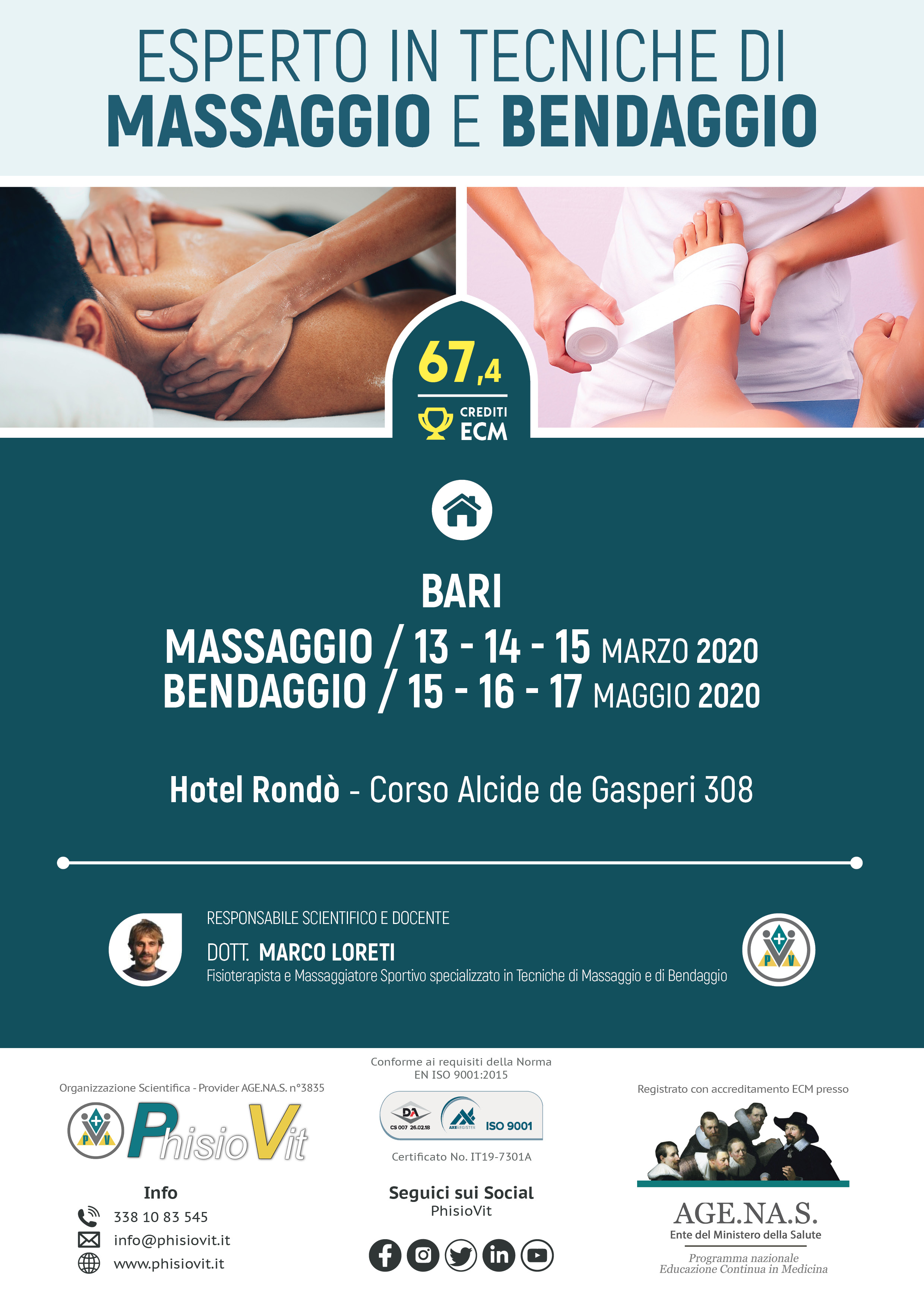 Esperto in Tecniche di Massaggio e Bendaggio è un progetto didattico che mira a formare i professionisti dell'area medica, riabilitativa e rieducativa nello studio delle basi teoriche del massaggio e del bendaggio, nelle principali tecniche di massoterapia, nei più comuni confezionamenti dei bendaggi e in come applicare tutto ciò alla varia casistica clinica. Include un pacchetto promozionale di due corsi ed eroga complessivamente 67,4 crediti ECM. I due eventi inclusi sono: "Teorie e Tecniche del Massaggio", 33,7 crediti ECM, Bari 13-14-15 marzo 2020 e "Teorie e Tecniche del Bendaggio", 33,7 crediti ECM, Bari 15-16-17 maggio 2020.