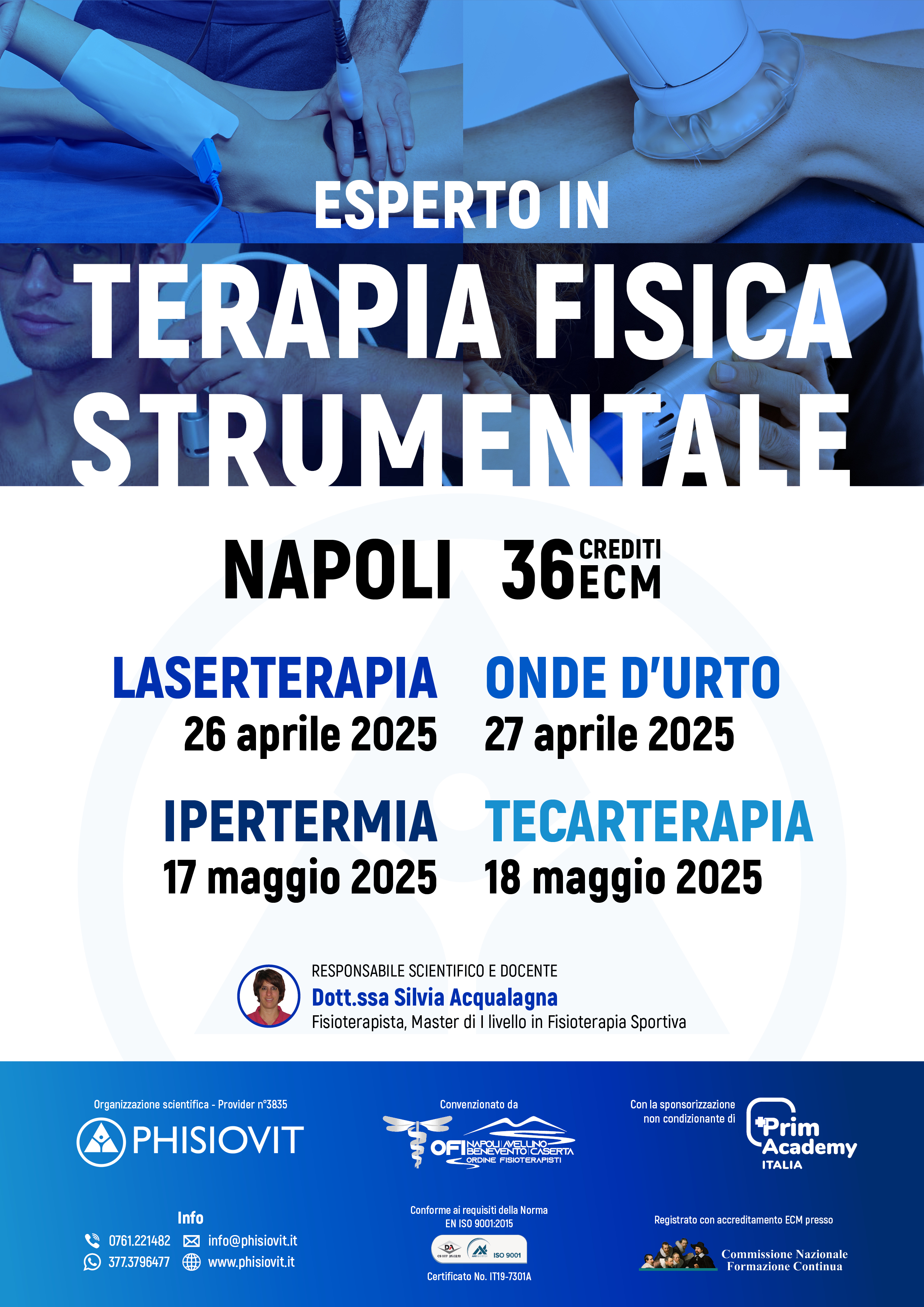 Esperto in Terapia Fisica Strumentale è un progetto didattico che mira a formare i professionisti dell'area riabilitativa e rieducativa nella terapia fisica strumentale, include un pacchetto promozionale di quattro corsi ed eroga complessivamente 36 crediti ECM. I quattro eventi inclusi sono: "La Laserterapia: Terapia Manuale ed Esercizio Terapeutico", 9 crediti ECM, Napoli 26 aprile 2025 e "Le Onde d'Urto: Terapia Manuale ed Esercizio Terapeutico", 9 crediti ECM, Napoli 27 aprile 2025, "L'Ipertermia: Terapia Manuale ed Esercizio Terapeutico", 9 crediti ECM, Napoli 17 maggio 2025 e "La Tecarterapia: Terapia Manuale ed Esercizio Terapeutico", 9 crediti ECM, Napoli 18 maggio 2025.