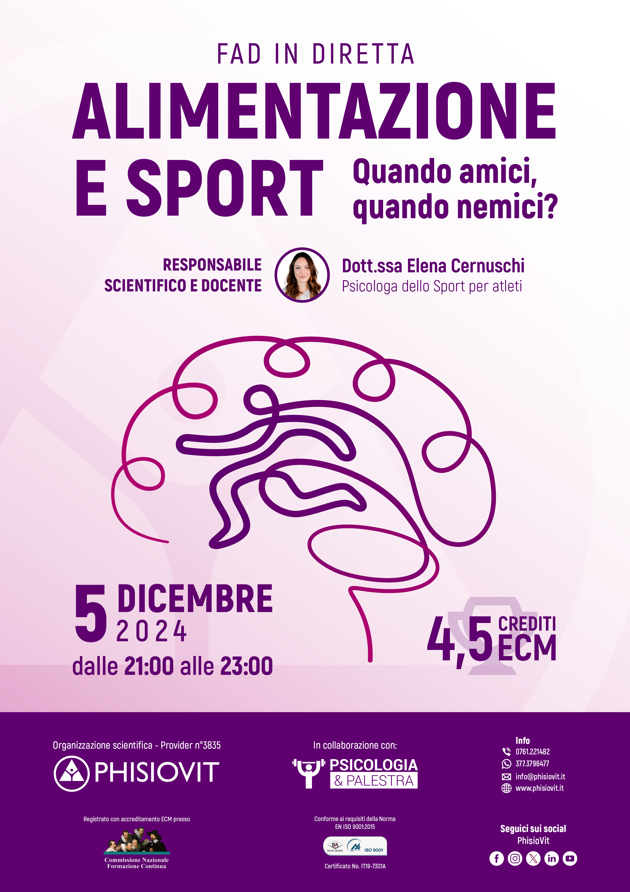 Il corso include spiegazioni teoriche approfondite, schemi riassuntivi, esempi e suggerimenti pratici per professionisti che lavorano in ambito sportivo. Dopo un’introduzione sull’importanza dell’alimentazione sana per il benessere e la salute mentale degli atleti, verranno approfondite le problematiche che possono insorgere nel rapporto con il cibo, analizzandone cause e fattori di rischio e potenziali impatti negativi sulla salute dell’individuo. Inoltre, si illustreranno le ragioni e le modalità per instaurare una relazione sana e consapevole con la propria alimentazione e i segnali del proprio corpo. Successivamente, verrà dato spazio al potenziale intervento delle figure sportivo-sanitarie, offrendo spunti pratici di prevenzione, comprensione e intervento. Infine, verrà approfondita la figura dello psicoterapeuta e di come possa essere d’aiuto a professionisti che lavorano in ambito sportivo.