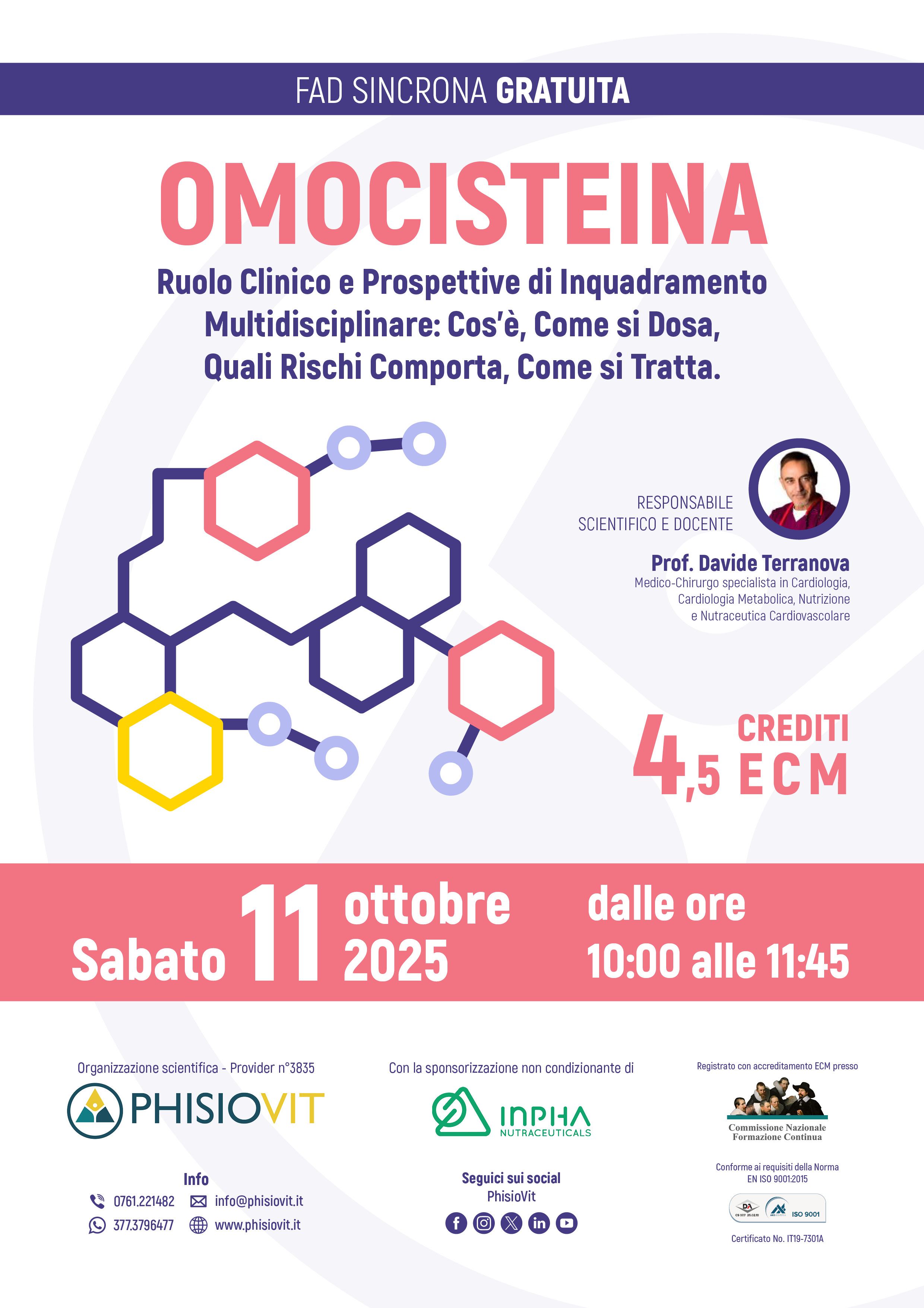 L'omocisteina è un amminoacido solforato intermedio del metabolismo della metionina, normalmente presente in piccole quantità nel sangue. In condizioni di livelli fuori controllo di omocisteina si parla di iperomocisteinemia, associata a un aumentato rischio cardiovascolare, neurodegenerativo e ostetrico. Tuttavia, il suo significato clinico rimane ancora oggetto di dibattito, sia per quanto riguarda l’effettivo ruolo causale nelle patologie, sia per la definizione dell’approccio terapeutico più appropriato. Sebbene ancora poco conosciuta nella pratica clinica quotidiana, l’omocisteina rappresenta un potenziale fattore di rischio trasversale, coinvolto in processi di infiammazione sistemica, stress ossidativo e disfunzione endoteliale. Numerosi studi ne evidenziano il legame con patologie croniche a elevato impatto epidemiologico, aprendo nuove prospettive in termini di prevenzione, diagnosi precoce e trattamento. Nonostante ciò, il dosaggio dell'omocisteina è ancora scarsamente integrato nella routine diagnostica, spesso a causa di una scarsa conoscenza dei range di riferimento, delle indicazioni cliniche e delle strategie terapeutiche disponibili. Questo evento FAD sincrono si propone di offrire una visione aggiornata, critica e multidisciplinare sull’inquadramento dell’omocisteina nella pratica clinica quotidiana, attraverso un linguaggio chiaro ma rigoroso, basato su quattro pilastri fondamentali: