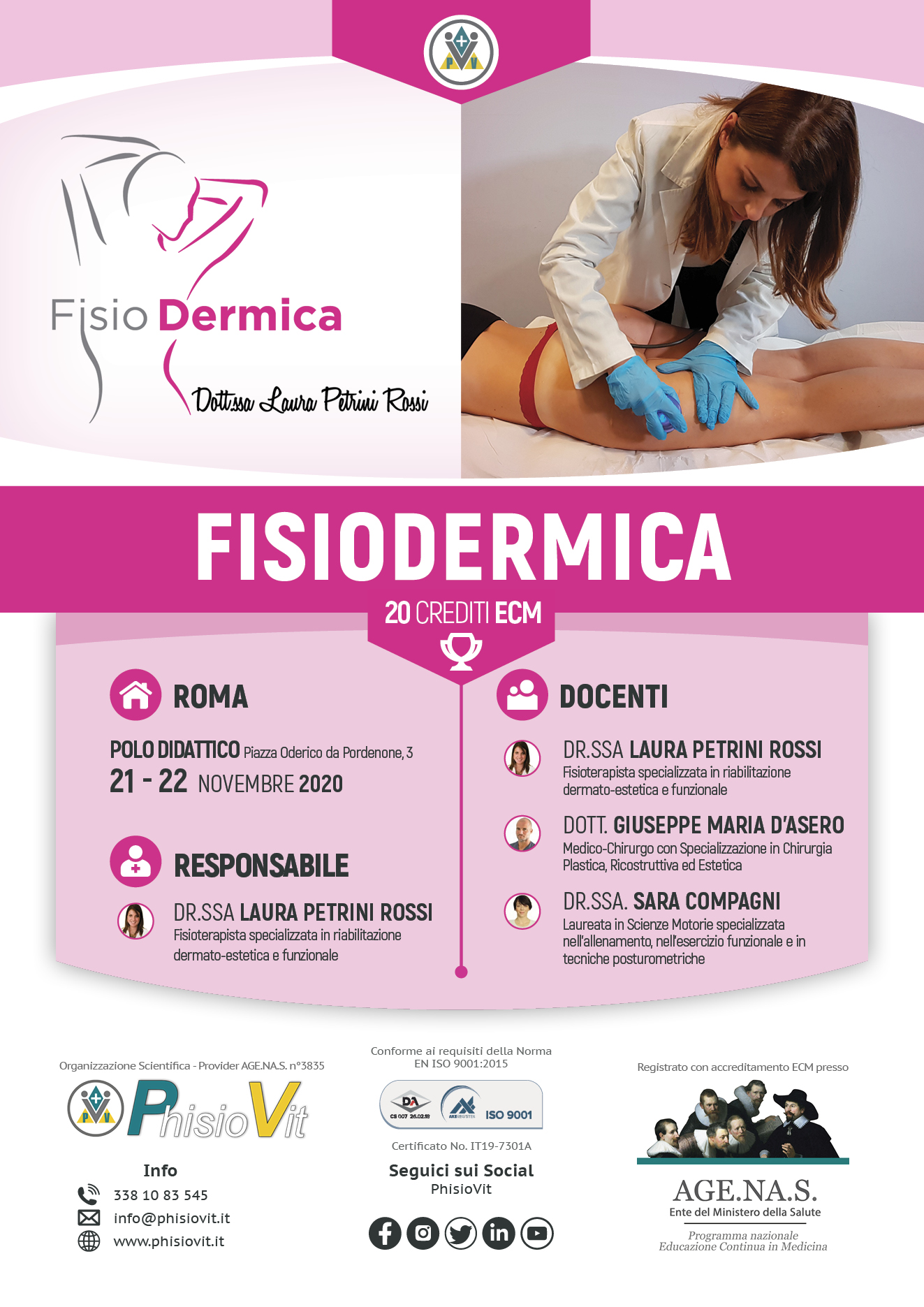 Questo corso è specificamente progettato per educare il discente al trattamento per mezzo di tecniche dermato-estetiche del microcircolo, del sistema linfatico, delle disfunzioni dell'apparato tegumentario e del post chirurgico come blefaroplastica, addominoplastica, mastoplastica additiva o riduttiva, mastectomia, liposuzione e liposcultura. Dopo aver seguito questi due intensi giorni caratterizzati dal 70% di pratica e dal 30% di teoria, il discente impara a riconoscere le indicazioni e le controindicazioni al trattamento delle patologie dermato-estetiche e funzionali, a pianificare il percorso riabilitativo, ad utilizzare le tecniche e gli strumenti quali gli elettromedicali, gli esercizi ipopressivi, il drenaggio linfatico post chirurgia plastica ed estetica, l'allenamento dei soggetti androidi e ginoidi. Nel corpo docenti di questo corso è molto importante ricordare la presenza di un medico-chirurgo con specializzazione in chirurgia plastica, ricostruttiva ed estetica, di una fisioterapista specializzata in riabilitazione dermato-estetica e funzionale e di una laureata in scienze motorie specializzata nell'allenamento e nell'educazione agli esercizi per questa tipologia di pazienti.