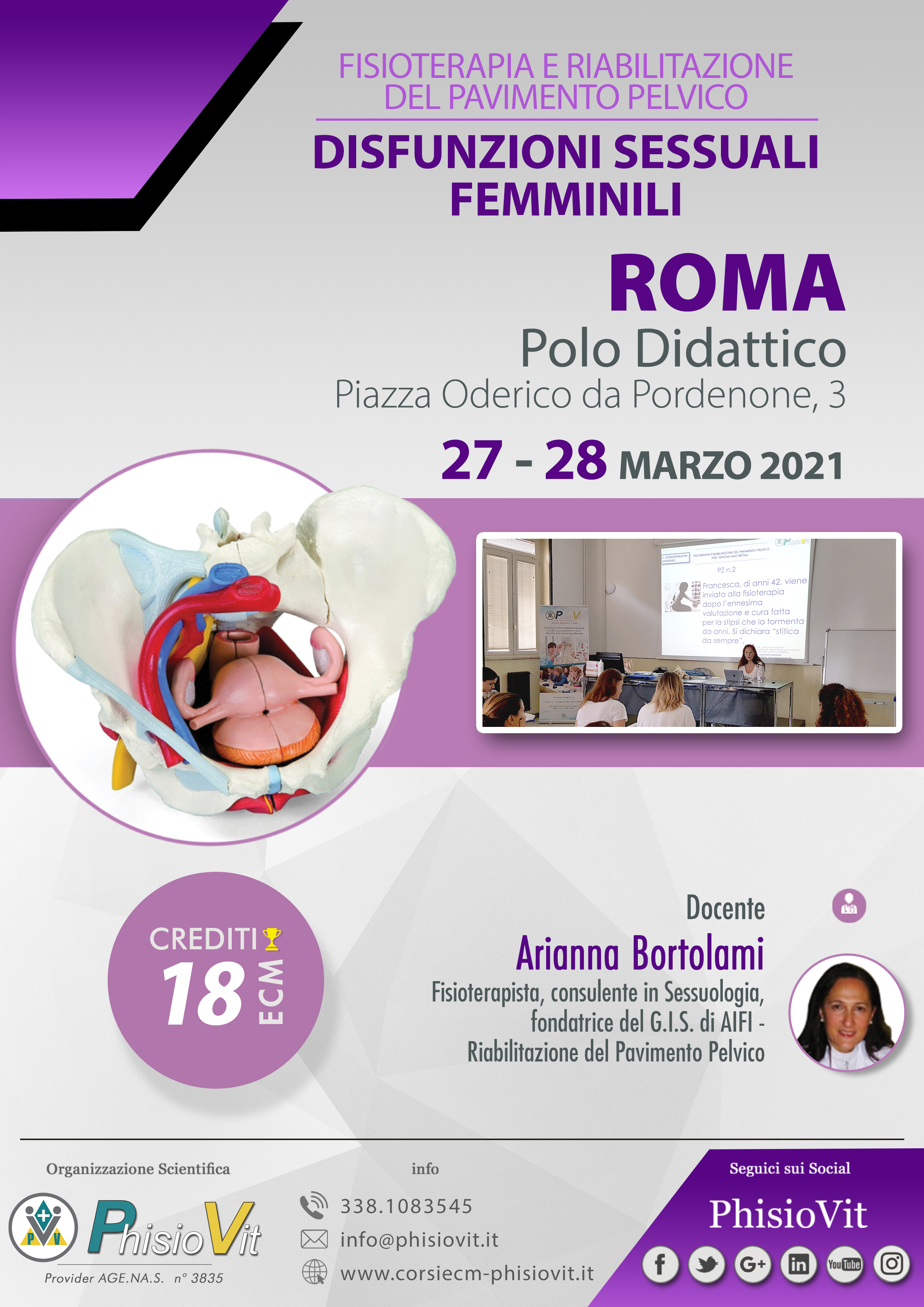 Il corso, della durata di due giorni consecutivi (27-28 marzo 2021 "Fisioterapia e Riabilitazione del Pavimento Pelvico per le disfunzioni sessuali femminili") è tenuto dalla Dr.ssa Arianna Bortolami, fisioterapista con laurea magistrale in Scienze delle Professioni Sanitarie della Riabilitazione, consulente in Sessuologia, fondatrice del G.I.S. di AIFI - Riabilitazione del Pavimento Pelvico -, autrice del testo: Riabilitazione del Pavimento Pelvico, Masson Elsevier, 2009. Le sessioni pratiche sono strutturate in modo che l'esercitazione pratica individuale sia fatta su manichino, mentre quella di gruppo attraverso role playing tra fisioterapista e paziente sulla valutazione funzionale.