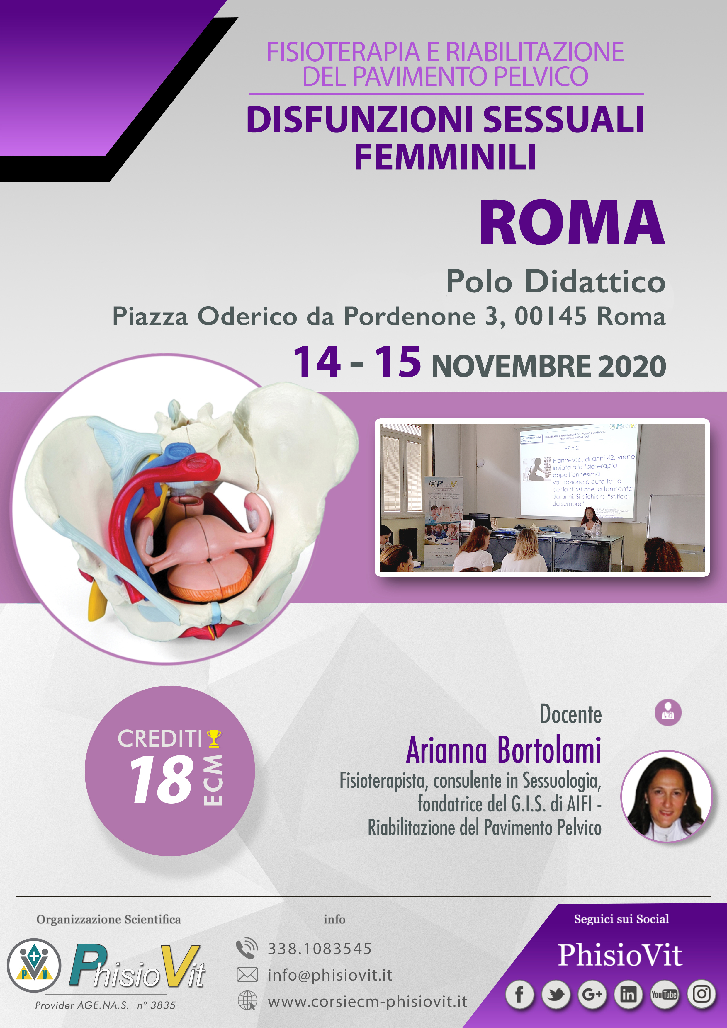 Il corso, della durata di due giorni consecutivi (14-15 novembre 2020 "Fisioterapia e Riabilitazione del Pavimento Pelvico per le disfunzioni sessuali femminili") è tenuto dalla Dr.ssa Arianna Bortolami, fisioterapista con laurea magistrale in Scienze delle Professioni Sanitarie della Riabilitazione, consulente in Sessuologia, fondatrice del G.I.S. di AIFI - Riabilitazione del Pavimento Pelvico -, autrice del testo: Riabilitazione del Pavimento Pelvico, Masson Elsevier, 2009. Le sessioni pratiche sono strutturate in modo che l'esercitazione pratica individuale sia fatta su manichino, mentre quella di gruppo attraverso role playing tra fisioterapista e paziente sulla valutazione funzionale.
