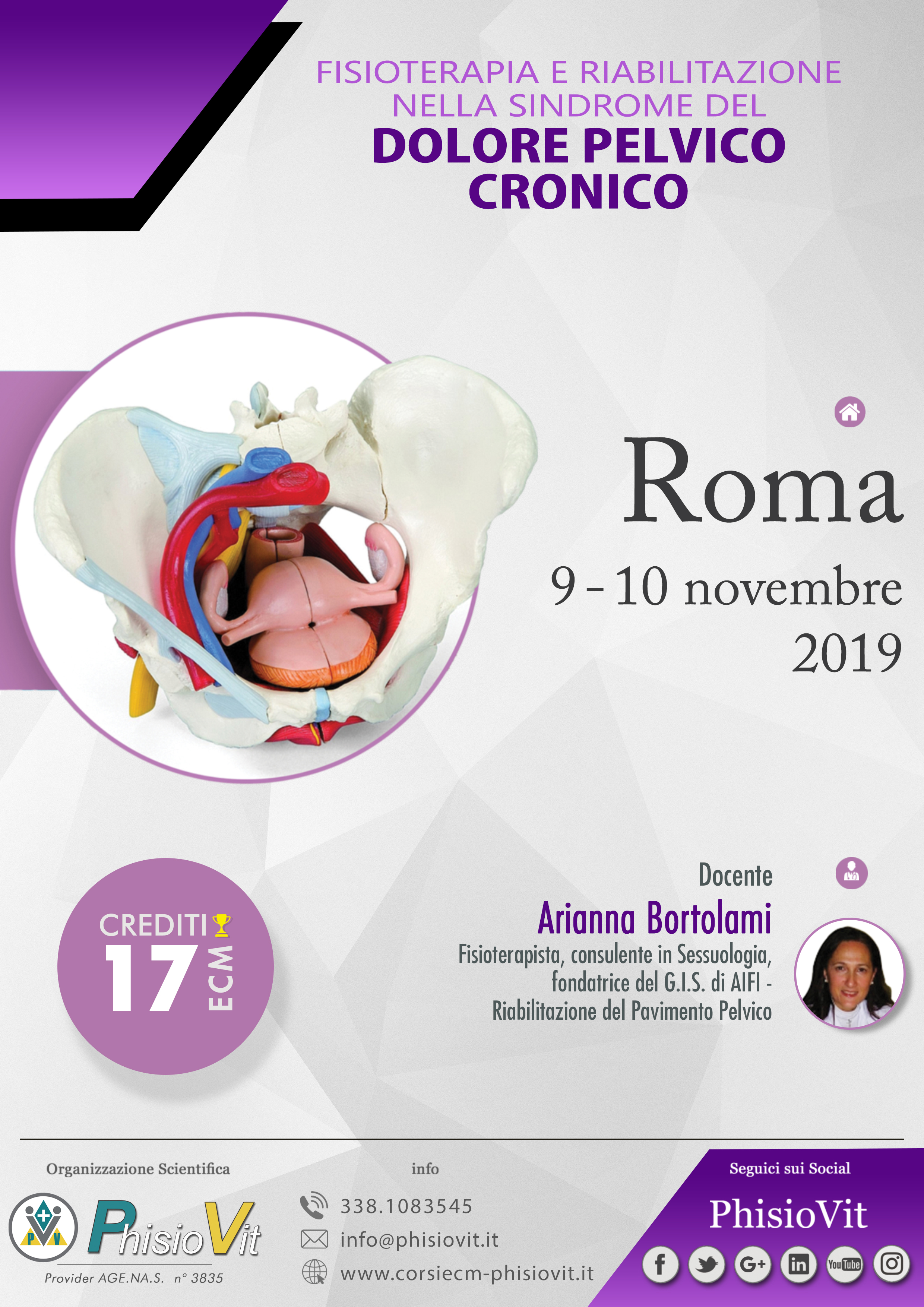 Il corso, della durata di due giorni consecutivi (9-10 novembre "Fisioterapia e Riabilitazione nella sindrome del dolore pelvico cronico") è tenuto dalla Dr.ssa Arianna Bortolami, fisioterapista con laurea magistrale in Scienze delle Professioni Sanitarie della Riabilitazione, consulente in Sessuologia, fondatrice del G.I.S. di AIFI - Riabilitazione del Pavimento Pelvico -, autrice del testo: Riabilitazione del Pavimento Pelvico, Masson Elsevier, 2009. Le sessioni pratiche sono strutturate in modo che l'esercitazione pratica individuale sia fatta su manichino, mentre quella di gruppo attraverso role playing tra fisioterapista e paziente sulla valutazione funzionale.