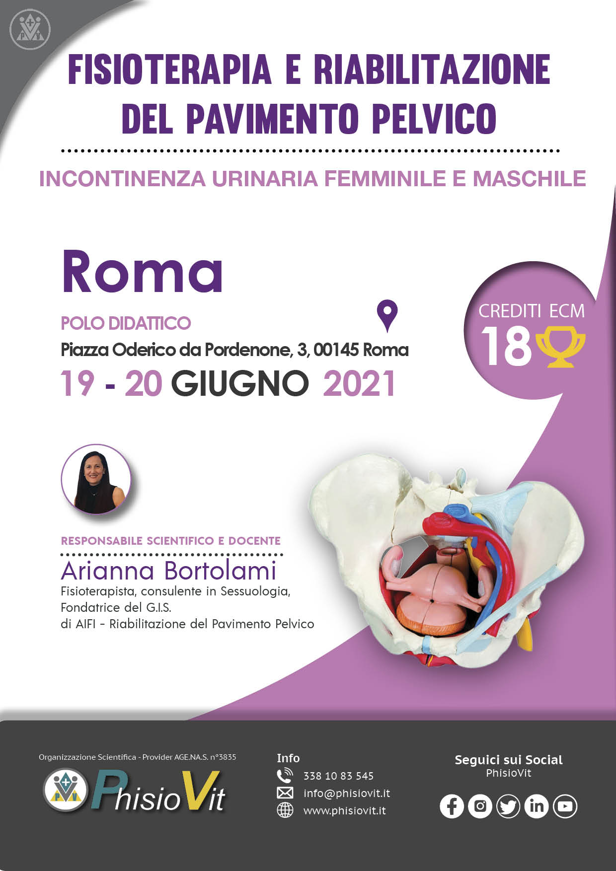 Il corso, della durata di due giorni consecutivi (19-20 giugno 2021 "Fisioterapia e riabilitazione del pavimento pelvico nell'incontinenza urinaria femminile e maschile") è tenuto dalla Dr.ssa Arianna Bortolami, fisioterapista con laurea magistrale in Scienze delle Professioni Sanitarie della Riabilitazione, consulente in Sessuologia, fondatrice del G.I.S. di AIFI - Riabilitazione del Pavimento Pelvico -, autrice del testo: Riabilitazione del Pavimento Pelvico, Masson Elsevier, 2009. Le sessioni pratiche sono strutturate in modo che l'esercitazione pratica individuale sia fatta su manichino, mentre quella di gruppo attraverso role playing tra fisioterapista e paziente sulla valutazione funzionale.
