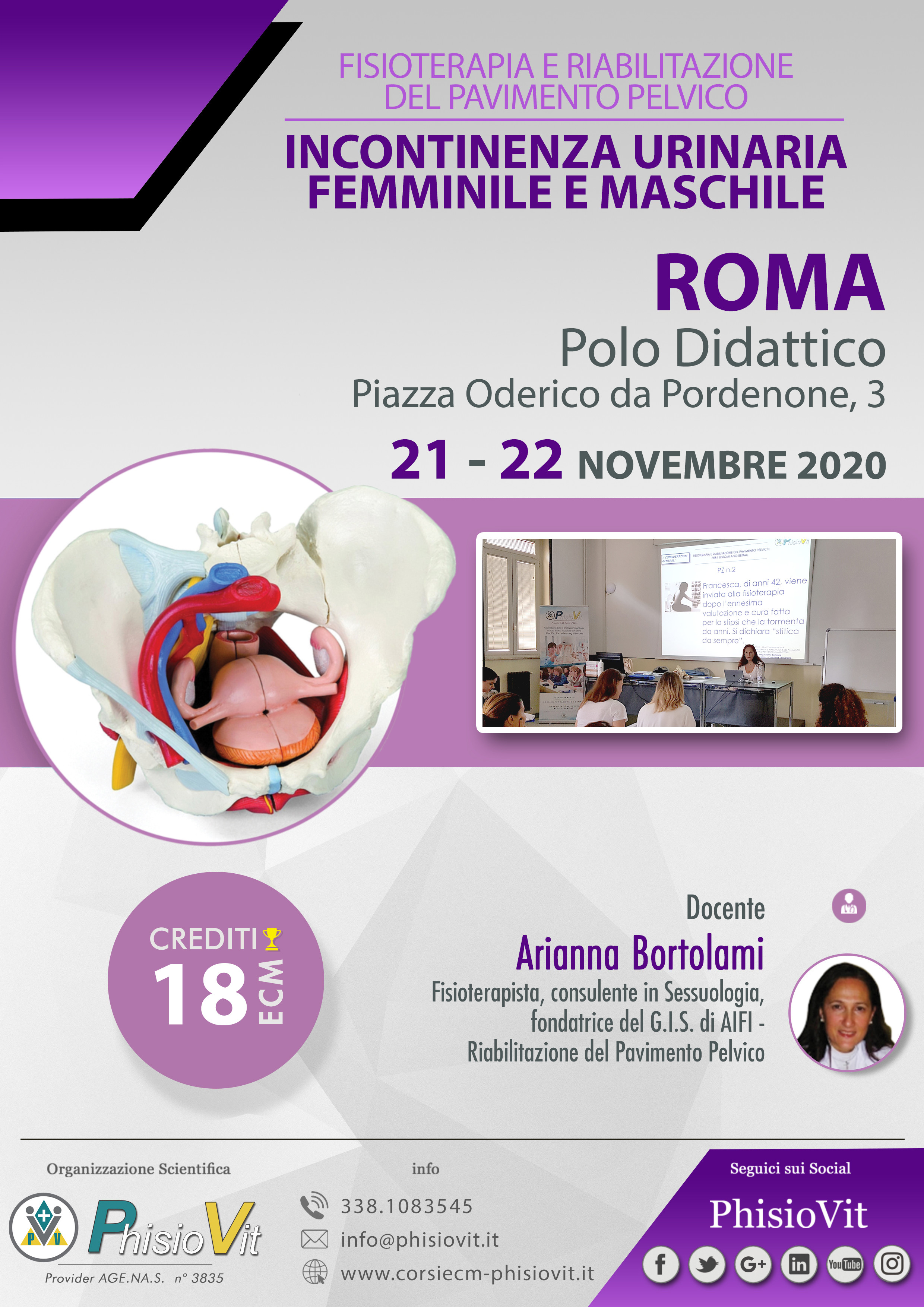 Il corso, della durata di due giorni consecutivi (21-22 novembre 2020 "Fisioterapia e riabilitazione del pavimento pelvico nell'incontinenza urinaria femminile e maschile") è tenuto dalla Dr.ssa Arianna Bortolami, fisioterapista con laurea magistrale in Scienze delle Professioni Sanitarie della Riabilitazione, consulente in Sessuologia, fondatrice del G.I.S. di AIFI - Riabilitazione del Pavimento Pelvico -, autrice del testo: Riabilitazione del Pavimento Pelvico, Masson Elsevier, 2009. Le sessioni pratiche sono strutturate in modo che l'esercitazione pratica individuale sia fatta su manichino, mentre quella di gruppo attraverso role playing tra fisioterapista e paziente sulla valutazione funzionale.
