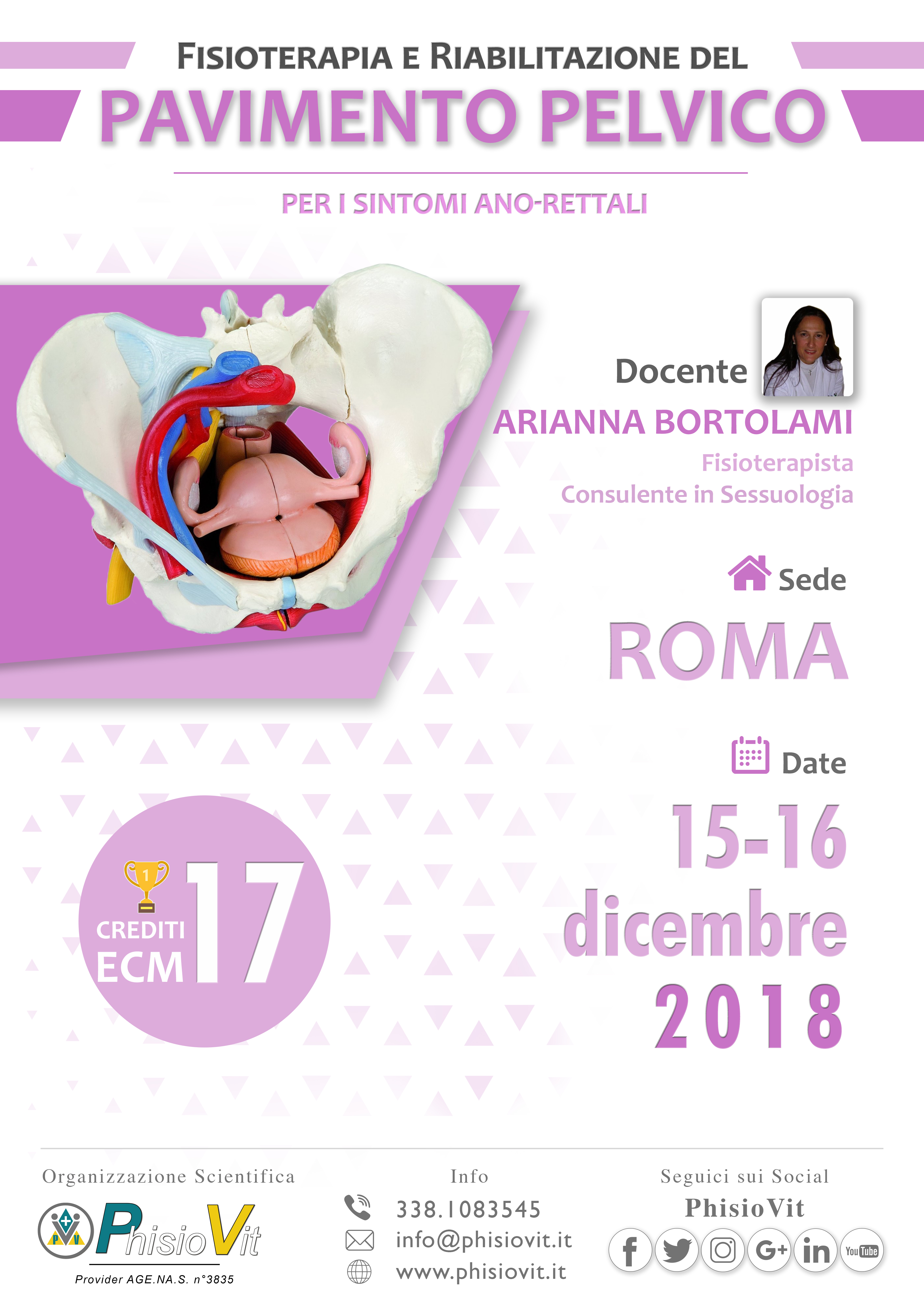 Il corso, della durata di due giorni consecutivi (15-16 dicembre "Fisioterapia e Riabilitazione del Pavimento Pelvico per i sintomi ano-rettali") è tenuto dalla Dr.ssa Arianna Bortolami, fisioterapista con laurea magistrale in Scienze delle Professioni Sanitarie della Riabilitazione, consulente in Sessuologia, fondatrice del G.I.S. di AIFI - Riabilitazione del Pavimento Pelvico -, autrice del testo: Riabilitazione del Pavimento Pelvico, Masson Elsevier, 2009. Le sessioni pratiche sono strutturate in modo che l'esercitazione pratica individuale sia fatta su manichino, mentre quella di gruppo attraverso role playing tra fisioterapista e paziente sulla valutazione funzionale.