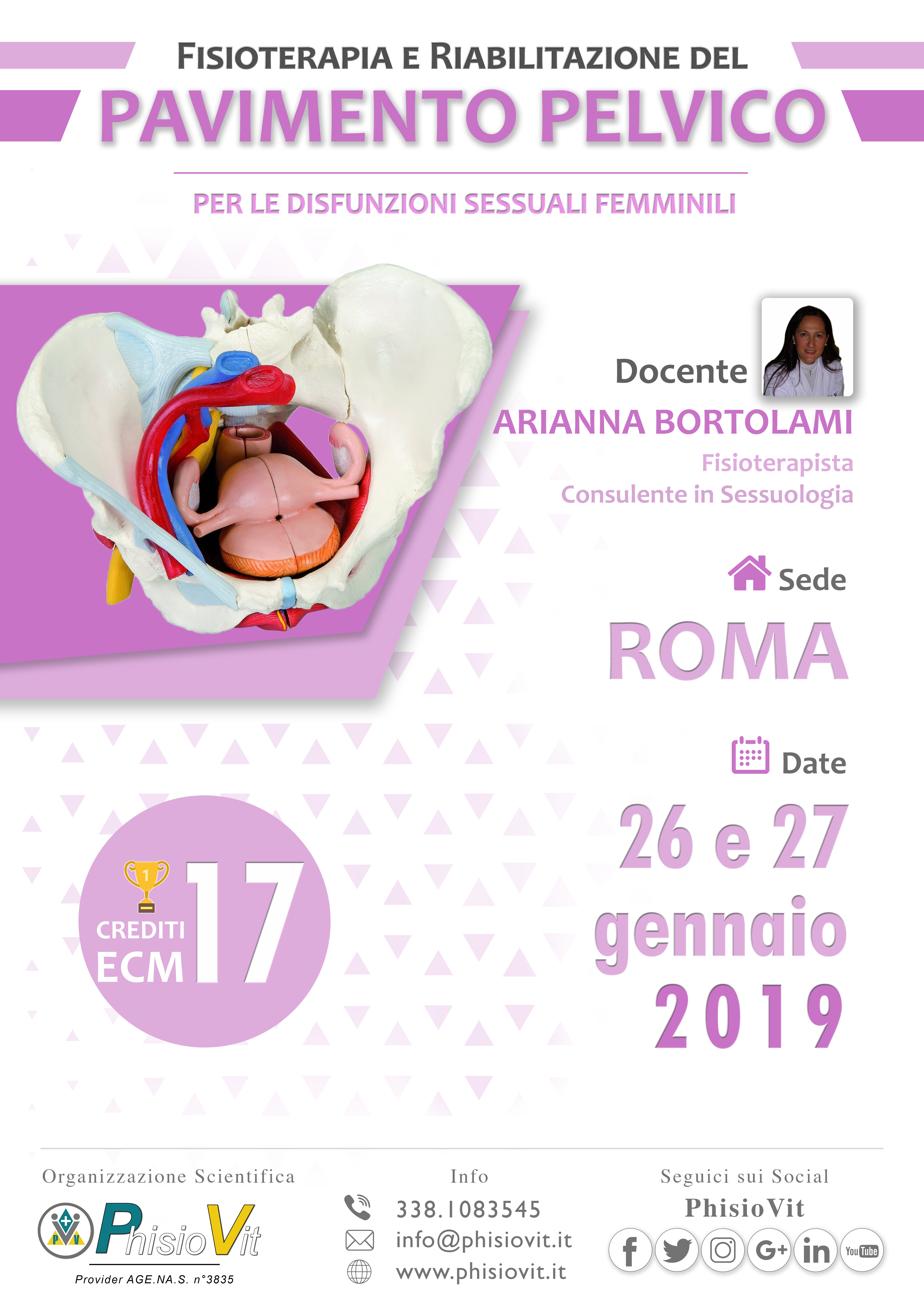 Il corso, della durata di due giorni consecutivi (26-27 gennaio "Fisioterapia e Riabilitazione del Pavimento Pelvico per le disfunzioni sessuali femminili") è tenuto dalla Dr.ssa Arianna Bortolami, fisioterapista con laurea magistrale in Scienze delle Professioni Sanitarie della Riabilitazione, consulente in Sessuologia, fondatrice del G.I.S. di AIFI - Riabilitazione del Pavimento Pelvico -, autrice del testo: Riabilitazione del Pavimento Pelvico, Masson Elsevier, 2009. Le sessioni pratiche sono strutturate in modo che l'esercitazione pratica individuale sia fatta su manichino, mentre quella di gruppo attraverso role playing tra fisioterapista e paziente sulla valutazione funzionale.