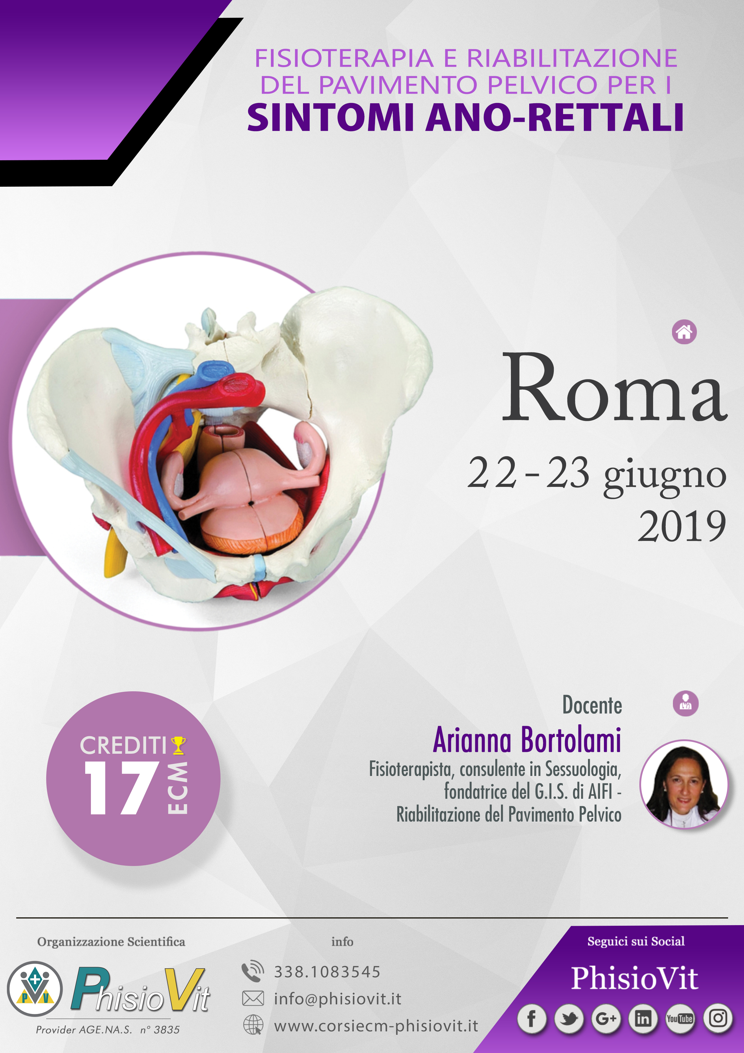 Il corso, della durata di due giorni consecutivi (22-23 giugno 2019 "Fisioterapia e Riabilitazione del Pavimento Pelvico per i sintomi ano-rettali") è tenuto dalla Dr.ssa Arianna Bortolami, fisioterapista con laurea magistrale in Scienze delle Professioni Sanitarie della Riabilitazione, consulente in Sessuologia, fondatrice del G.I.S. di AIFI - Riabilitazione del Pavimento Pelvico -, autrice del testo: Riabilitazione del Pavimento Pelvico, Masson Elsevier, 2009. Le sessioni pratiche sono strutturate in modo che l'esercitazione pratica individuale sia fatta su manichino, mentre quella di gruppo attraverso role playing tra fisioterapista e paziente sulla valutazione funzionale.