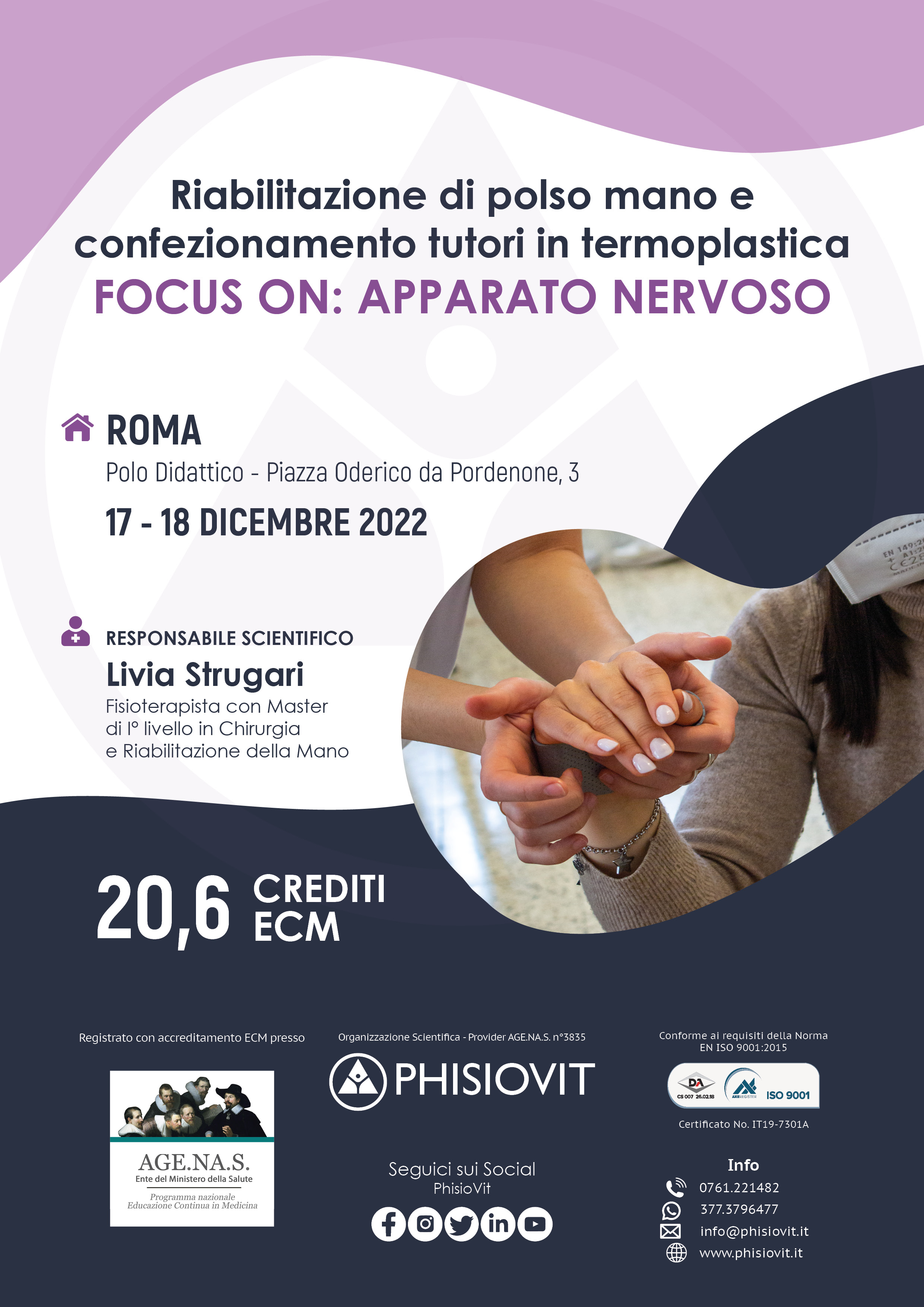 Questo corso, specifico sulla riabilitazione di polso e mano, è stato accuratamente progettato con il preciso fine di istruire i professionisti dell'area riabilitativa sul trattamento conservativo delle patologie compressive dei nervi. La riabilitazione deve essere mirata e tempestiva, al fine di evitare che una condizione normalmente solo temporanea e risolvibile, non evolva in un danno progressivo, persistente ed irreparabile. L'utilizzo di un tutore fatto su misura è una soluzione che permette, immobilizzando le articolazioni a monte e a valle della compressione, di ridurre la componente articolare di costrizione, lasciando il nervo più libero e decompresso nel tempo in cui il tutore viene indossato. A tale trattamento viene associato un percorso di terapia occupazionale e di riabilitazione: quest'ultima prevede tecniche specifiche che attingono da discipline come la terapia manuale, la neurodinamica, le tecniche di mobilizzazione etc. partendo dallo studio anatomico e biomeccanico della mano. Ampio respiro nella didattica viene dato inoltre alla nota sindrome dolorosa regionale complessa (algoneurodistrofia), sindrome di grande interesse in questo ambito.