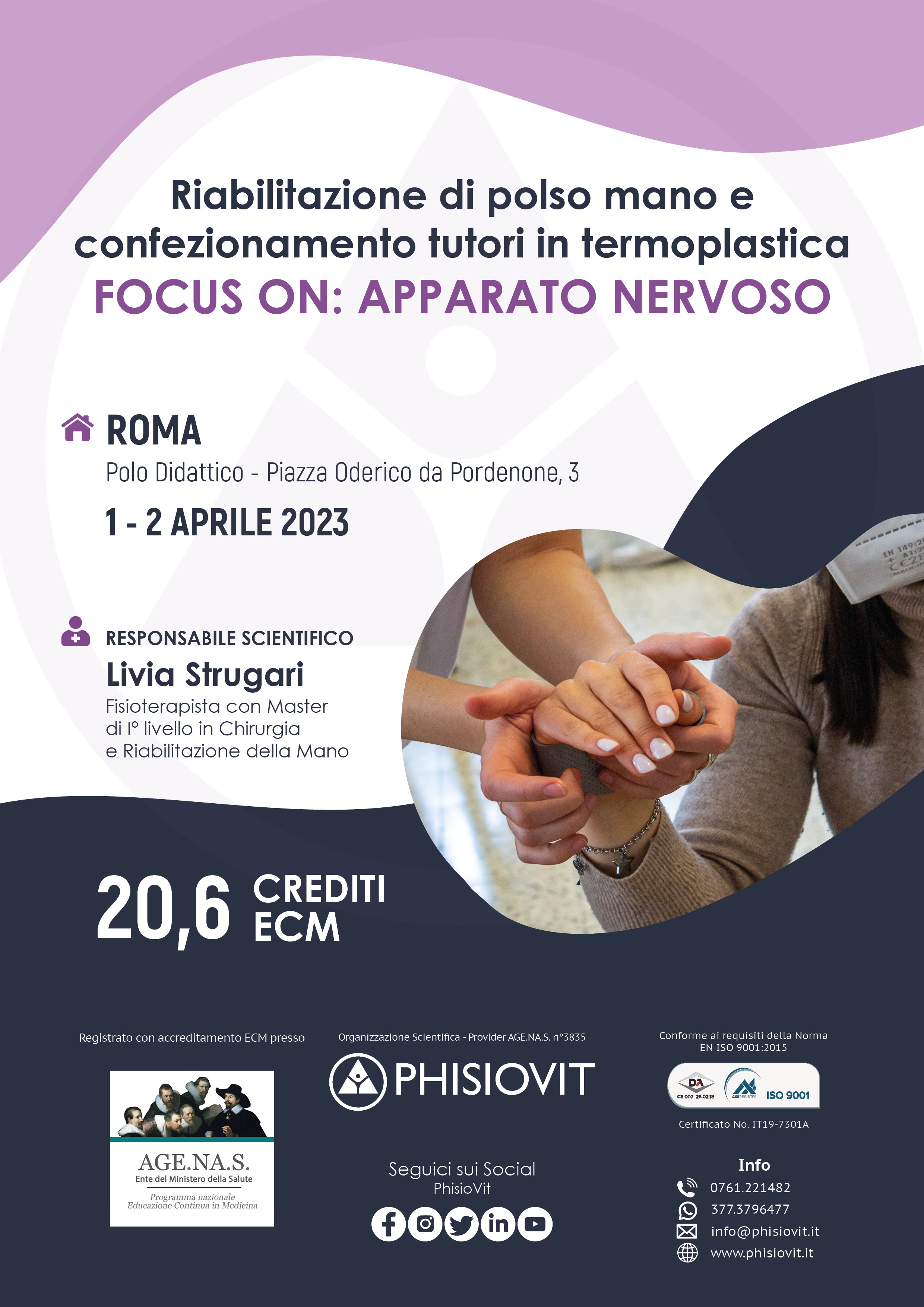 Questo corso, specifico sulla riabilitazione di polso e mano, è stato accuratamente progettato con il preciso fine di istruire i professionisti dell'area riabilitativa sul trattamento conservativo delle patologie compressive dei nervi. La riabilitazione deve essere mirata e tempestiva, al fine di evitare che una condizione normalmente solo temporanea e risolvibile, non evolva in un danno progressivo, persistente ed irreparabile. L'utilizzo di un tutore fatto su misura è una soluzione che permette, immobilizzando le articolazioni a monte e a valle della compressione, di ridurre la componente articolare di costrizione, lasciando il nervo più libero e decompresso nel tempo in cui il tutore viene indossato. A tale trattamento viene associato un percorso di terapia occupazionale e di riabilitazione: quest'ultima prevede tecniche specifiche che attingono da discipline come la terapia manuale, la neurodinamica, le tecniche di mobilizzazione etc. partendo dallo studio anatomico e biomeccanico della mano. Ampio respiro nella didattica viene dato inoltre alla nota sindrome dolorosa regionale complessa (algoneurodistrofia), sindrome di grande interesse in questo ambito.