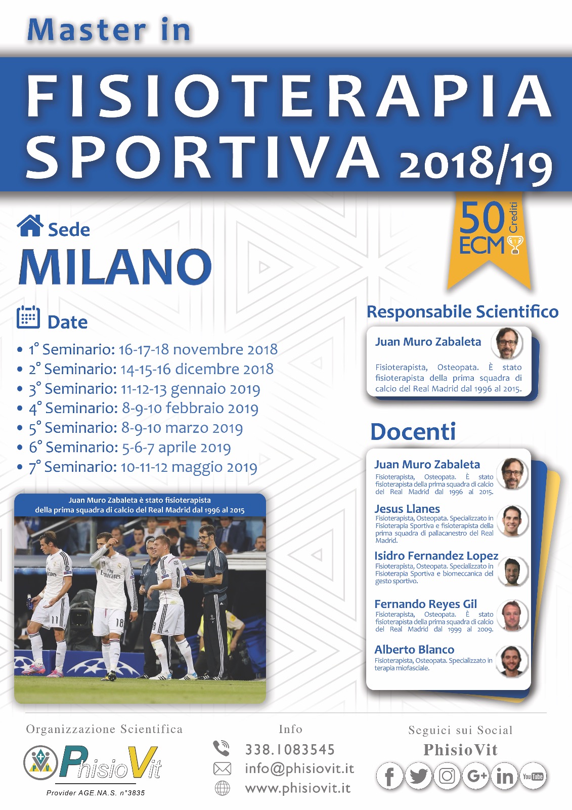 Il Master, della durata di ventuno giorni non consecutivi, è articolato in sette seminari di tre giorni ciascuno (16-17-18 novembre 2018, 14-15-16 dicembre 2018, 11-12-13 gennaio 2019, 8-9-10 febbraio 2019, 8-9-10 marzo 2019, 5-6-7 aprile 2019 e 10-11-12 maggio 2019< "Master in Fisioterapia Sportiva"). Ogni singolo seminario prevede ventuno ore di didattica per centoquarantasette ore totali articolate in lezioni frontali di carattere teorico e corpose parti pratiche con tutoraggio dei docenti. Gli orari di ogni singolo seminario sono: venerdì dalle 15.30 alle 20.30, sabato dalle 9.00 alle 20.00, domenica dalle 9.00 alle 14.00. Il Master è tenuto interamente in lingua spagnola, con traduzione consecutiva in italiano, dai docenti internazionali Juan Muro Zabaleta, fisioterapista e osteopata, Fernando Reyes Gil, fisioterapista e terapista manuale OMT, Isidro Fernández López, fisioterapista e osteopata, Alberto Blanco Martinez, fisioterapista specializzato in terapia miofasciale, e Jesus Llanes Ontiveros, fisioterapista e osteopata. L'assistente e traduttrice prevista è la Dr.ssa Nicoletta Carai, fisioterapista e osteopata.