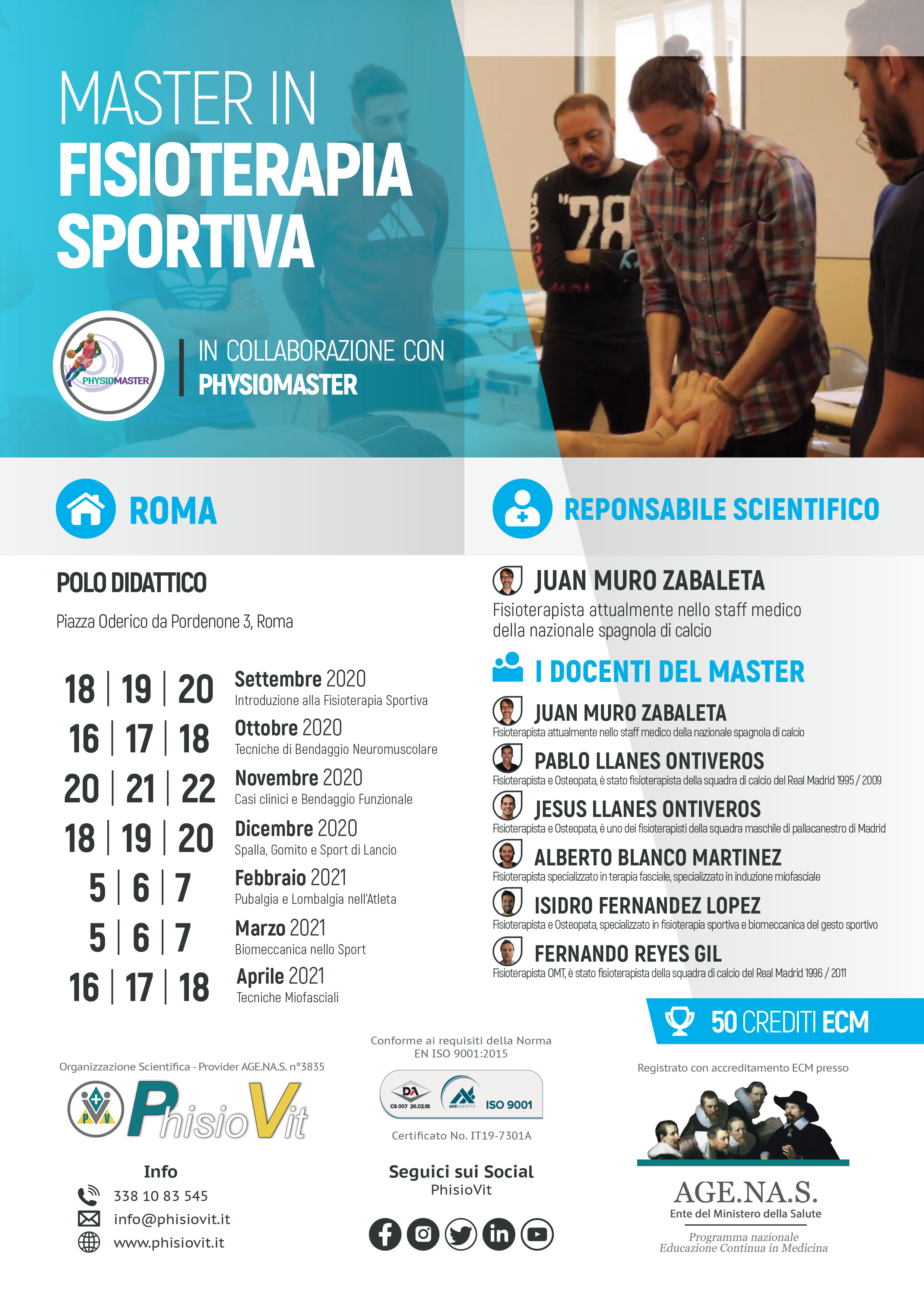 Il Master, della durata di ventuno giorni non consecutivi, è articolato in sette seminari di tre giorni ciascuno (18-19-20 settembre 2020, 16-17-18 ottobre 2020, 20-21-22 novembre 2020, 18-19-20 dicembre 2020, 5-6-7 febbraio 2021, 5-6-7 marzo 2021 e 16-17-18 aprile 2021 "Master in Fisioterapia Sportiva"). Ogni singolo seminario prevede ventuno ore di didattica per centoquarantasette ore totali articolate in lezioni frontali di carattere teorico e corpose parti pratiche con tutoraggio dei docenti. Il Master è tenuto interamente in lingua spagnola, con traduzione consecutiva in italiano, dai docenti internazionali Juan Muro Zabaleta, fisioterapista e osteopata, Pablo Llanes Ontiveros, fisioterapista e osteopata, Fernando Reyes Gil, fisioterapista e terapista manuale OMT, Isidro Fernández López, fisioterapista e osteopata, Alberto Blanco Martinez, fisioterapista specializzato in terapia miofasciale, e Jesus Llanes Ontiveros, fisioterapista e osteopata. Le assistenti e le traduttrici previste sono le dottoresse Nicoletta Carai, fisioterapista e osteopata, e Marta Levis, fisioterapista con master in terapia manuale orotopedica: la loro presenza è sempre singola, mai in coppia, ed è a discrezione di PhisioVit in quale seminario l'una o l'altra sono presenti.