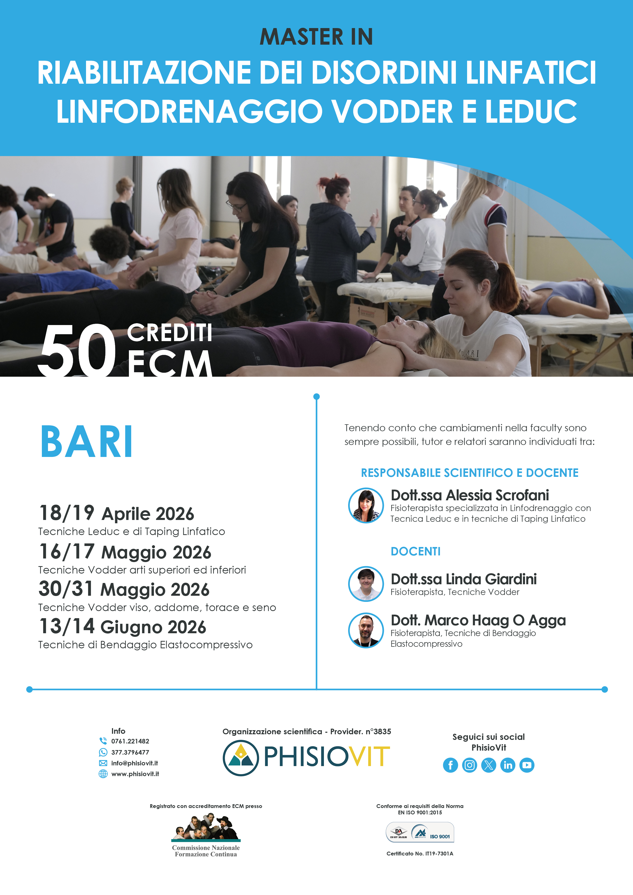 La formazione preliminare a distanza, inclusa nella quota d'iscrizione, assegna 12 crediti ECM aggiuntivi ai 38 crediti ECM previsti per le lezioni in presenza. Le lezioni in FAD sono tenute dal Dott. Paolo Gennaro, medico-chirurgo, dal Dott. Luca Gazzabin, medico-chirurgo, dalla Dott.ssa Alessia Scrofani, fisioterapista e responsabile scientifica del Master e dalla Dott.ssa Linda Giardini, fisioterapista e docente del metodo Vodder. Il percorso si conclude con prove orali e pratiche di verifica. L'attestato finale viene rilasciato al superamento delle valutazioni previste, certificando una specializzazione completa nella riabilitazione dei disordini linfatici e nelle tecniche di linfodrenaggio manuale oggi più diffuse e riconosciute a livello internazionale fra tutti i corsi di linfodrenaggio disponibili nell'offerta formativa dei provider ECM.