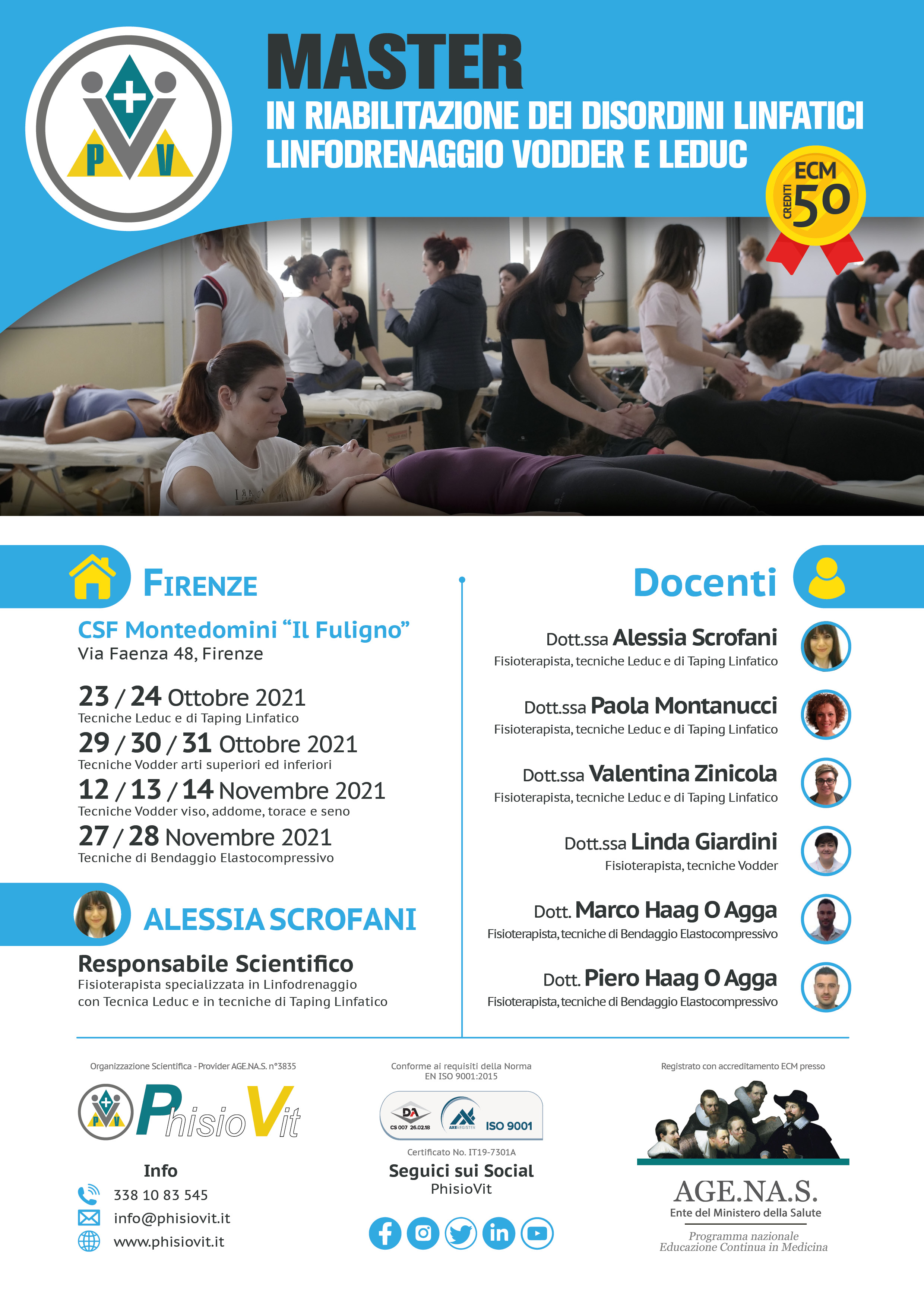 Il Master garantisce un'alta specializzazione in tutta la patologia linfatica, tale da consentire al professionista sanitario la gestione di ogni dinamica della riabilitazione ad essa associata: il discente infatti, al termine del percorso di studi, sarà in grado di avere tra le mani tutti i mezzi per trattare tali patologie, siano essi quelli di comprendere la cartella clinica dello specialista o di applicare i tre aspetti chiave delle linee guida per la malattia linfatica come il drenaggio linfatico manuale, il bendaggio elastocompressivo e l'esercizio terapeutico. Il cardine del progetto didattico è quello di dare particolare enfasi agli aspetti pratici riguardanti sia il drenaggio linfatico manuale con tecnica Vodder e Leduc che il bendaggio funzionale elastocompressivo che il taping linfatico. Non di secondaria importanza ciò che la responsabile scientifica del Master, Dr.ssa Alessia Scrofani, ha voluto inserire nel programma finale, ovvero tutto l'insieme di quelle sindromi linfatiche e compressive che investono lo stretto toracico superiore. Da ultimo vengono forniti tutti gli strumenti per essere in grado di bendare coi moderni approcci del taping linfatico, il discente sarà anche in grado di comprendere i mezzi diagnostici oggi usati per differenziare la malattia venosa da quella linfatica grazie al prezioso contributo scientifico e culturale offerto dai tre docenti titolari degli insegnamenti. Un mezzo essenziale quindi questo Master per specializzarsi nel mondo delle linfopatie e possedere tutti i mezzi per gestire il paziente con malattia linfatica, impostando sin dall'inizio, in collaborazione con l'équipe sanitaria, un lavoro pratico ed efficace, ripetibile ed efficiente. Questo Master può davvero dare al fisioterapista o al medico che vuole specializzarsi in tale ambito quel quid in più, orientandolo con sicurezza nella gestione delle patologie di carattere linfatico.