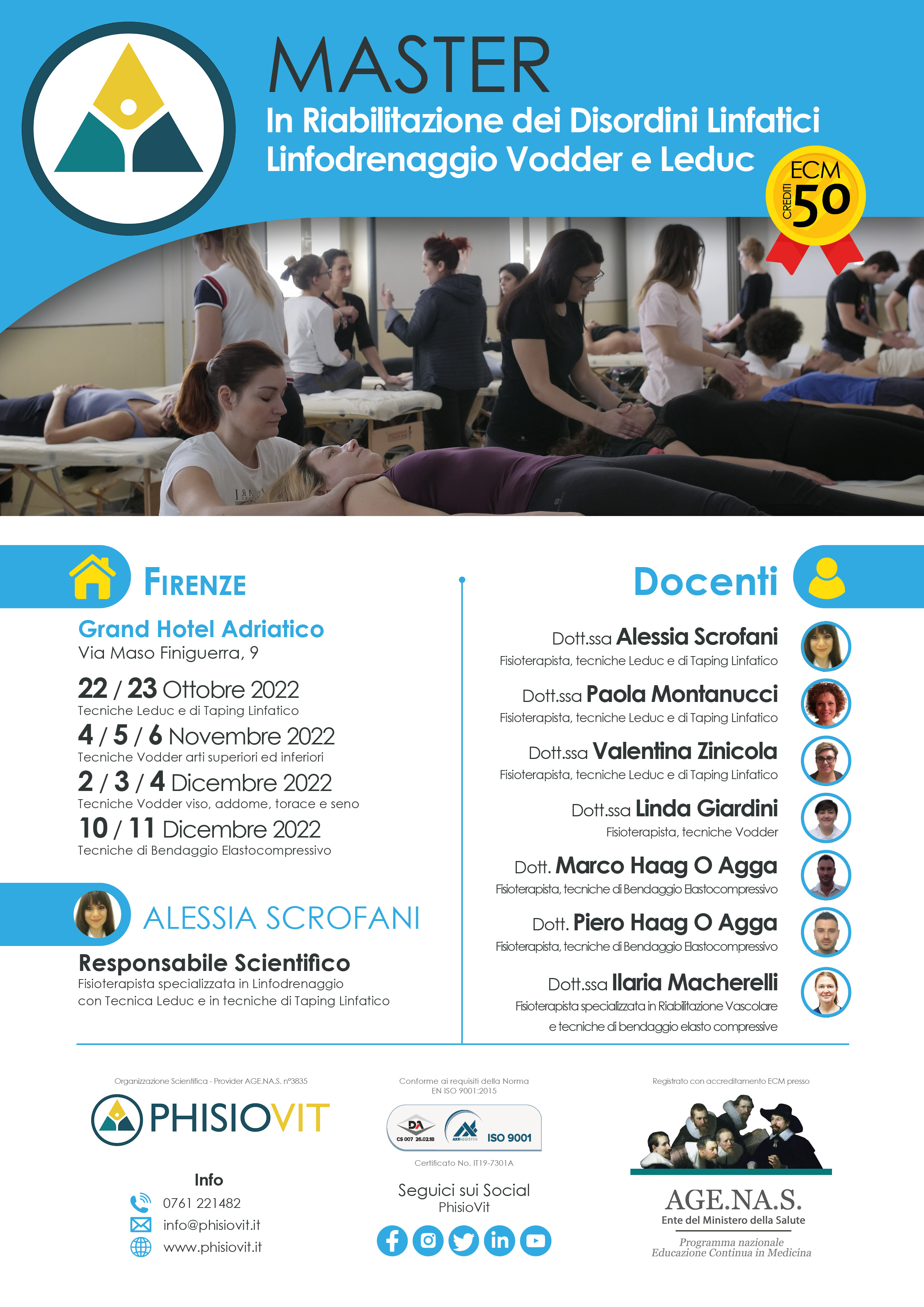 Il Master garantisce un'alta specializzazione in tutta la patologia linfatica, tale da consentire al professionista sanitario la gestione di ogni dinamica della riabilitazione ad essa associata: il discente infatti, al termine del percorso di studi, sarà in grado di avere tra le mani tutti i mezzi per trattare tali patologie, siano essi quelli di comprendere la cartella clinica dello specialista o di applicare i tre aspetti chiave delle linee guida per la malattia linfatica come il drenaggio linfatico manuale, il bendaggio elastocompressivo e l'esercizio terapeutico. Il cardine del progetto didattico è quello di dare particolare enfasi agli aspetti pratici riguardanti sia il drenaggio linfatico manuale con tecnica Vodder e Leduc che il bendaggio funzionale elastocompressivo che il taping linfatico. Non di secondaria importanza ciò che la responsabile scientifica del Master, Dott.ssa Alessia Scrofani, ha voluto inserire nel programma finale, ovvero tutto l'insieme di quelle sindromi linfatiche e compressive che investono lo stretto toracico superiore. Da ultimo vengono forniti tutti gli strumenti per essere in grado di bendare coi moderni approcci del taping linfatico, il discente sarà anche in grado di comprendere i mezzi diagnostici oggi usati per differenziare la malattia venosa da quella linfatica grazie al prezioso contributo scientifico e culturale offerto dai tre docenti titolari degli insegnamenti. Un mezzo essenziale quindi questo Master per specializzarsi nel mondo delle linfopatie e possedere tutti i mezzi per gestire il paziente con malattia linfatica, impostando sin dall'inizio, in collaborazione con l'équipe sanitaria, un lavoro pratico ed efficace, ripetibile ed efficiente. Questo Master può davvero dare al fisioterapista o al medico che vuole specializzarsi in tale ambito quel quid in più, orientandolo con sicurezza nella gestione delle patologie di carattere linfatico.