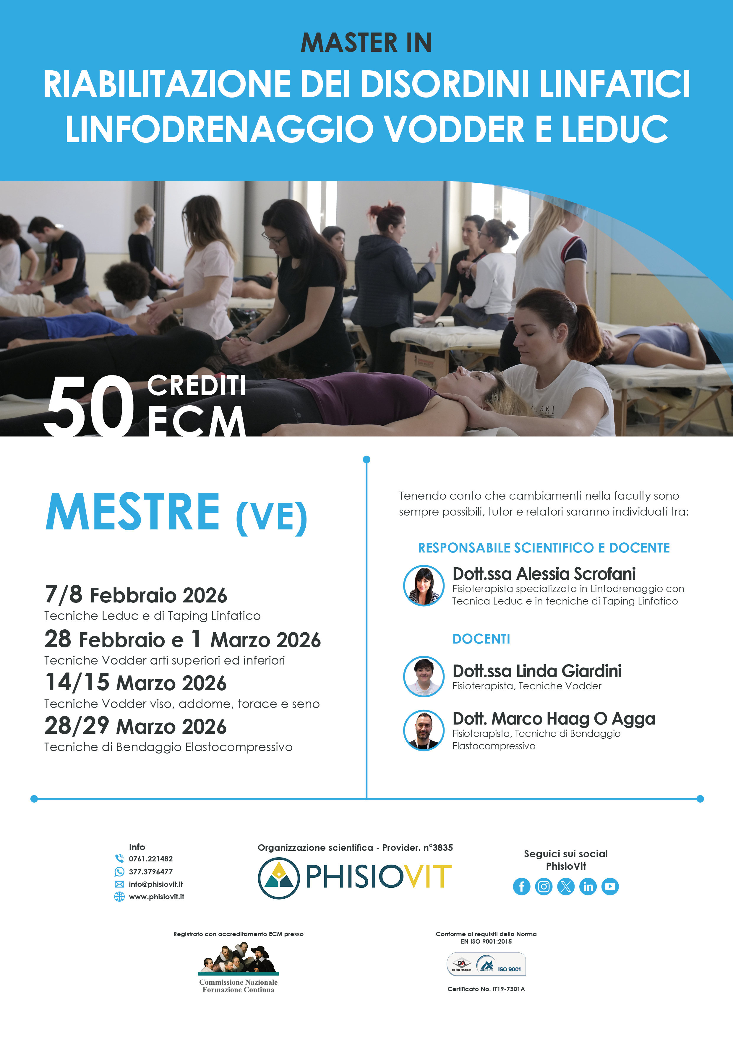 Il Master ECM in Riabilitazione dei Disordini Linfatici – Linfodrenaggio Vodder e Leduc è un percorso avanzato di formazione ECM dedicato al trattamento del linfedema e delle disfunzioni linfatiche, con tecniche Vodder e Leduc, bendaggi elastocompressivi ed esercizio terapeutico sotto compressione. L'intero programma didattico fornisce al discente competenze anatomiche, cliniche, diagnostiche e riabilitative sulle principali patologie linfatiche. L'obiettivo è sviluppare una conoscenza approfondita dei protocolli terapeutici più efficaci e aggiornati per la gestione del linfedema e delle disfunzioni del sistema linfatico, attraverso l'apprendimento delle seguenti tecniche: