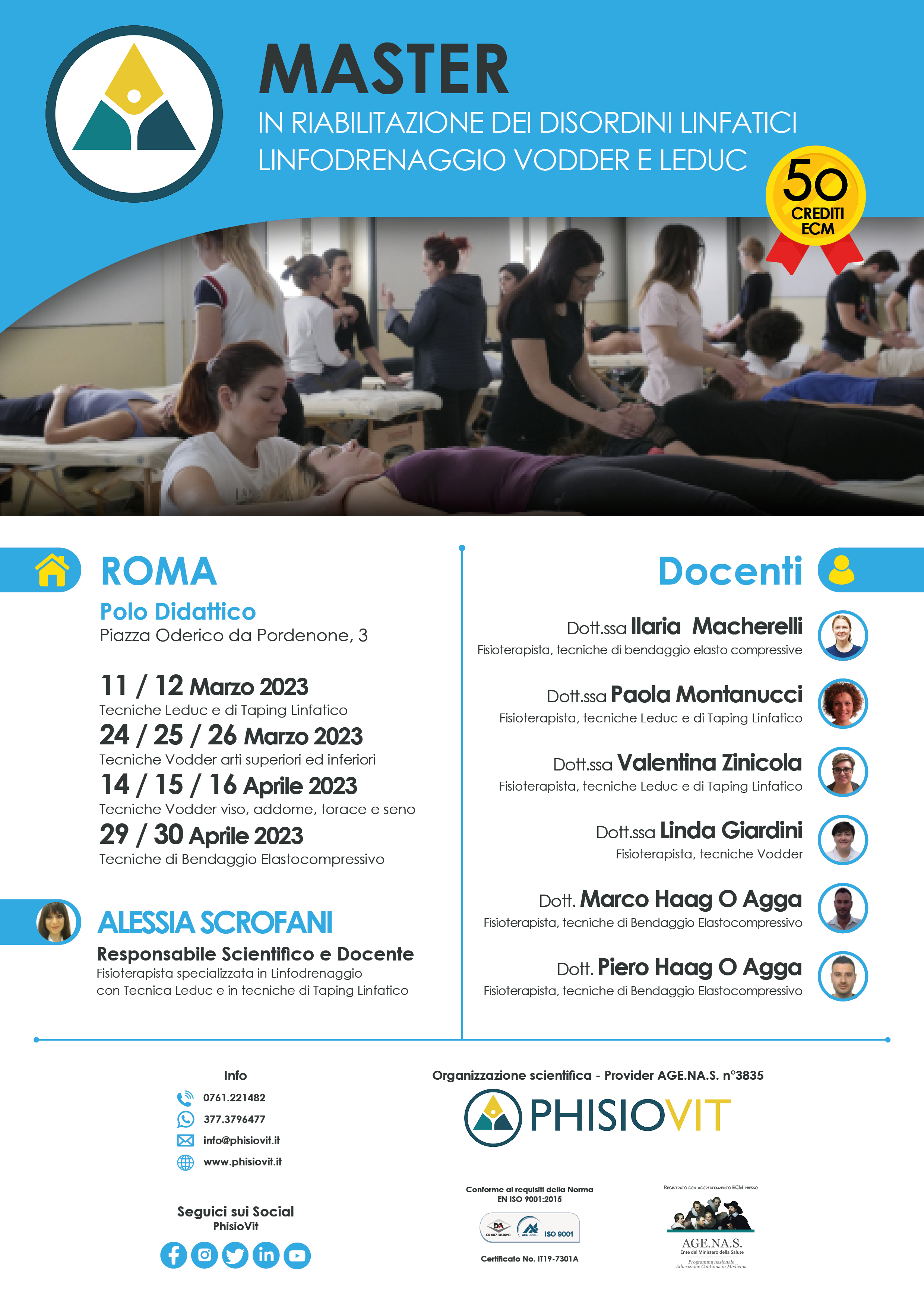 Il Master in Riabilitazione dei Disordini Linfatici - Linfodrenaggio Vodder e Leduc è strutturato per formare il discente sullo studio anatomico, clinico, diagnostico e riabilitativo delle patologie linfatiche grazie all'apprendimento dei protocolli terapeutici secondo le più recenti metodologie di lavoro e per mezzo delle differenti metodiche associate: