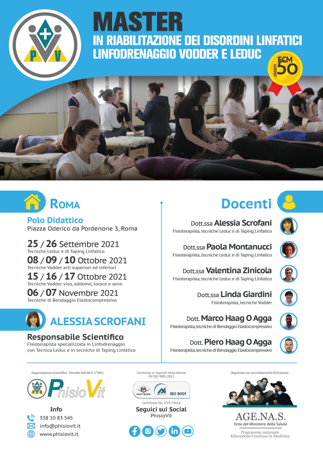 Il Master in Riabilitazione dei Disordini Linfatici - Linfodrenaggio Vodder e Leduc è strutturato per formare il discente sullo studio anatomico, clinico, diagnostico e riabilitativo delle patologie linfatiche grazie all'apprendimento dei protocolli terapeutici secondo le più recenti metodologie di lavoro e per mezzo delle differenti metodiche associate: