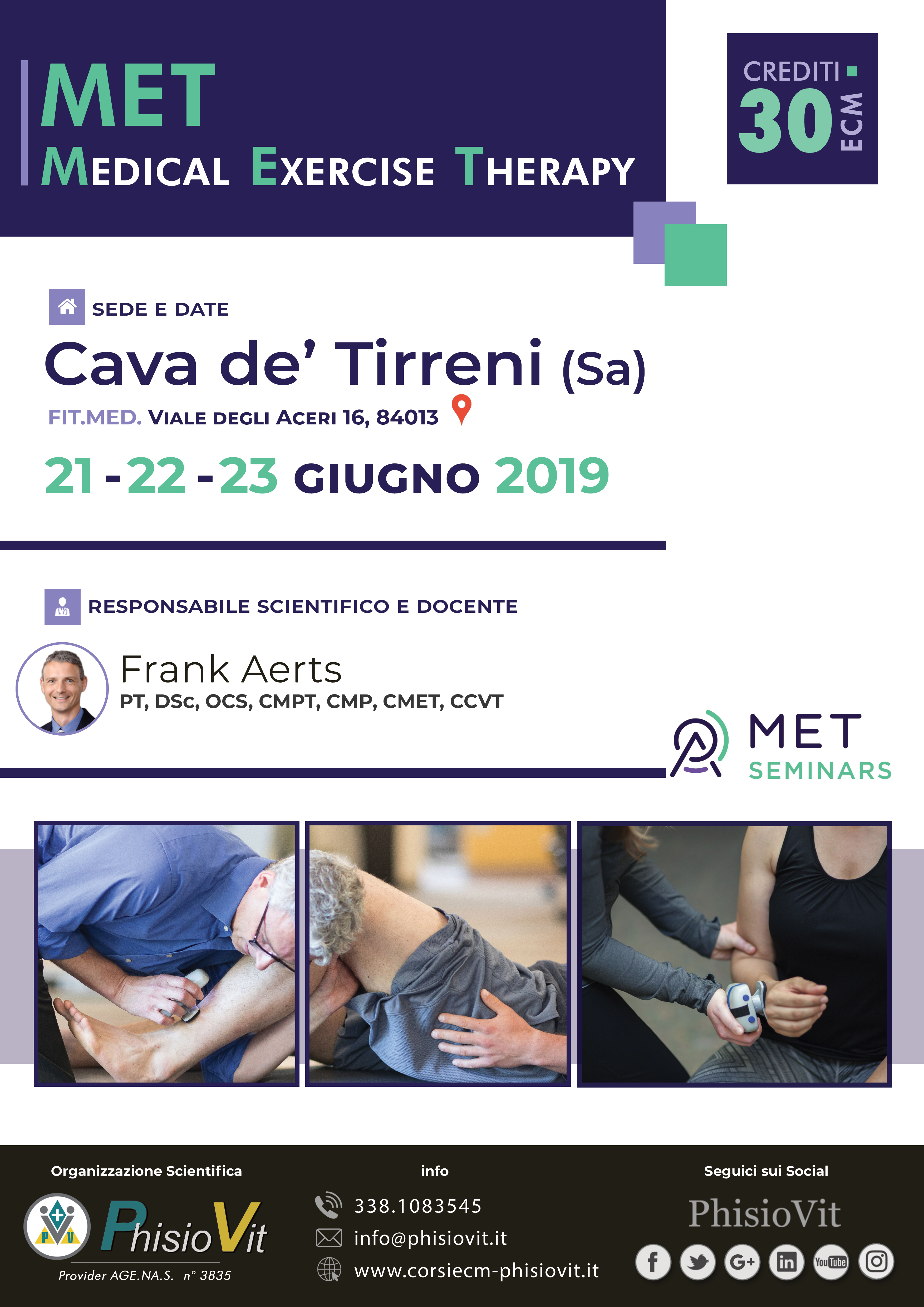 Frank Aerts, PT, DSc, OCS, CMPT, CMP, CMET, CCVT è il fondatore dei marchi MET (MET Seminars, MET Equipment, MET Consulting). È un lecturer internazionale, relatore invitato a numerosi congressi e docente di numerosi corsi di formazione legati all'esercizio terapeutico e alla medical exercise therapy per implementare una migliore riabilitazione clinica nella pratica quotidiana. È autore principale di "Inter-rater Reliability of Sustained Aberrant Movement Patterns as a Clinical Assessment of Muscular Fatigue" (2016) pubblicato su The Open Orthopedics Journal e co - autore del manuale "Hand - Held Dynamometry: Guidelines for Daily Clinical Practice" (2018). Ha 25 anni di esperienza come fisioterapista, esercita nella propria clinica ed è docente a contratto presso la Andrews University. Frank si è laureato alla Catholic University of Leuven nel 1990) e ha conseguito il proprio DSc presso la Andrews University nel 2012.