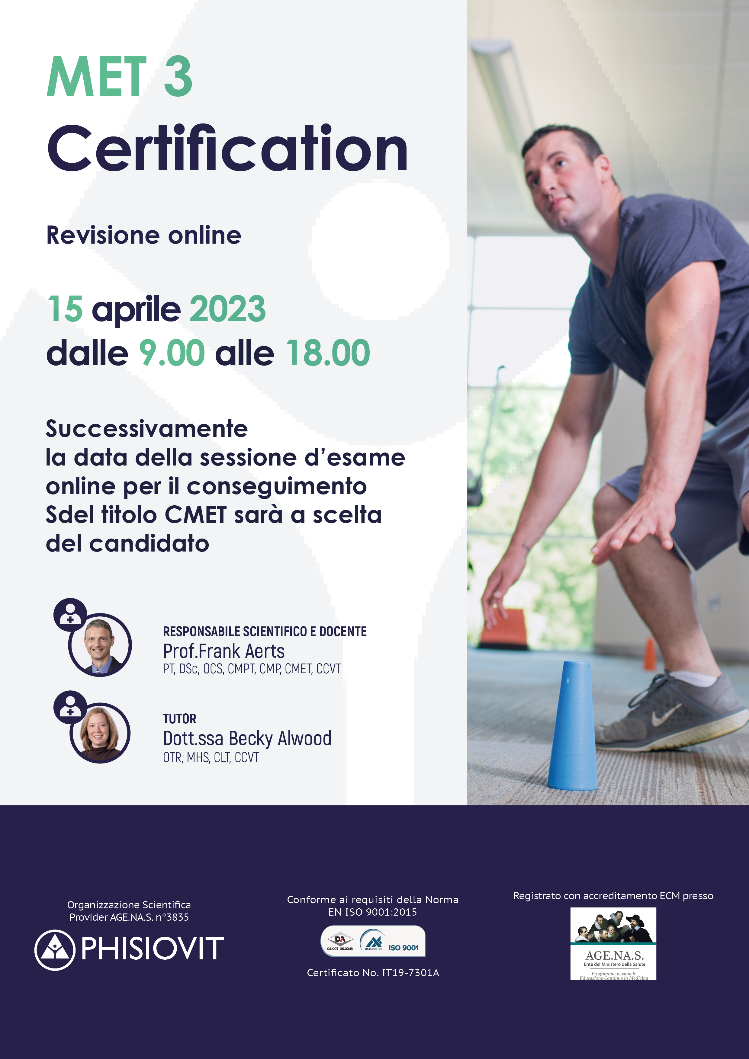 • MET3 - Certification è proposto in FAD sincrona il 15 aprile 2023: si tratta di una revisione online degli argomenti trattati precedentemente in aula con relatori in lingua inglese e traduttori in lingua italiana, una sessione utile per le preparazione alla successiva sessione d'esame a scelta del candidato. Il tutto al fine del conseguimento della certificazione CMET - Certified Medical Exercise Therapist.