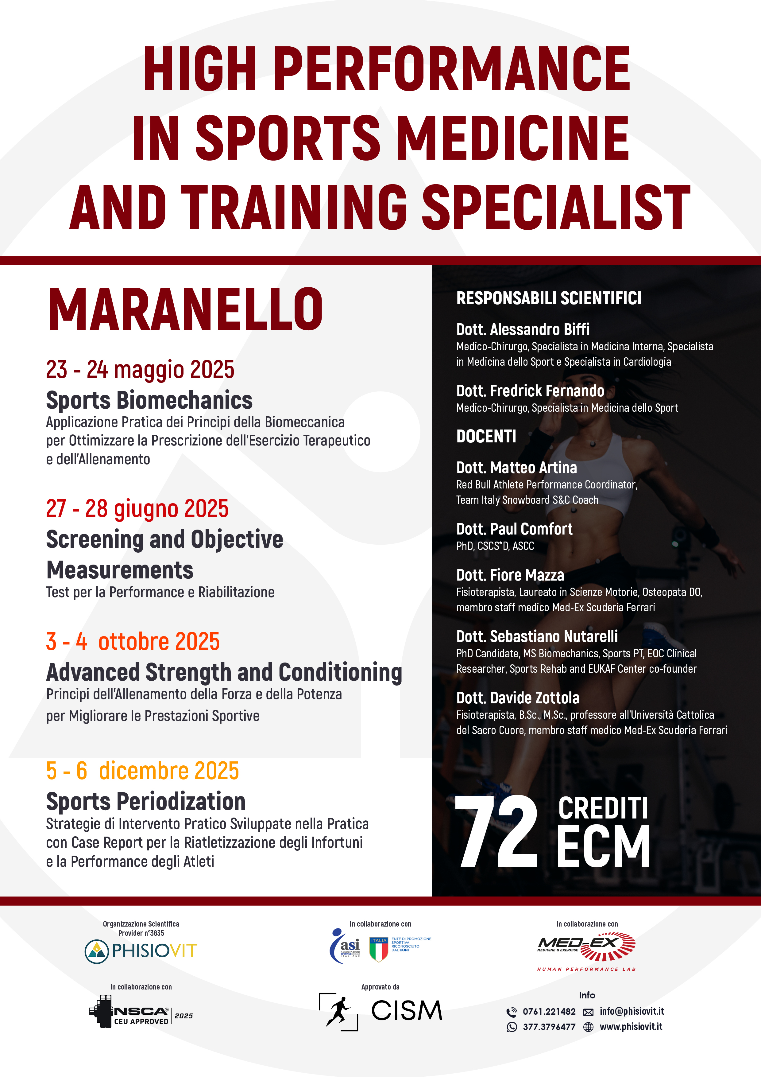 High Performance in Sports Medicine and Training Specialist è il programma di certificazione 2025-2026 dell'Academy Med-Ex, una realtà d'eccellenza specializzata nella promozione di programmi di prevenzione primaria sui corretti stili di vita attraverso check-up personalizzati e prescrizione di programmi di esercizio fisico tesi ad ottimizzare la performance atletica mediante test standardizzati e analisi avanzata dei dati. Questo progetto didattico esclusivo dell'Academy Med-Ex, articolato in otto giornate intensive, è progettato per formare professionisti d'élite nell'area medica, riabilitativa, rieducativa e sportiva con competenze avanzate in biomeccanica, screening funzionale, strength and conditioning e periodizzazione sportiva dell'atleta. Il percorso, strutturato in un esclusivo pacchetto promozionale di quattro corsi, eroga complessivamente 72 crediti ECM e 6 CEUs (Continuing Education Units), quest'ultimi da NSCA®. I quattro eventi inclusi sono: