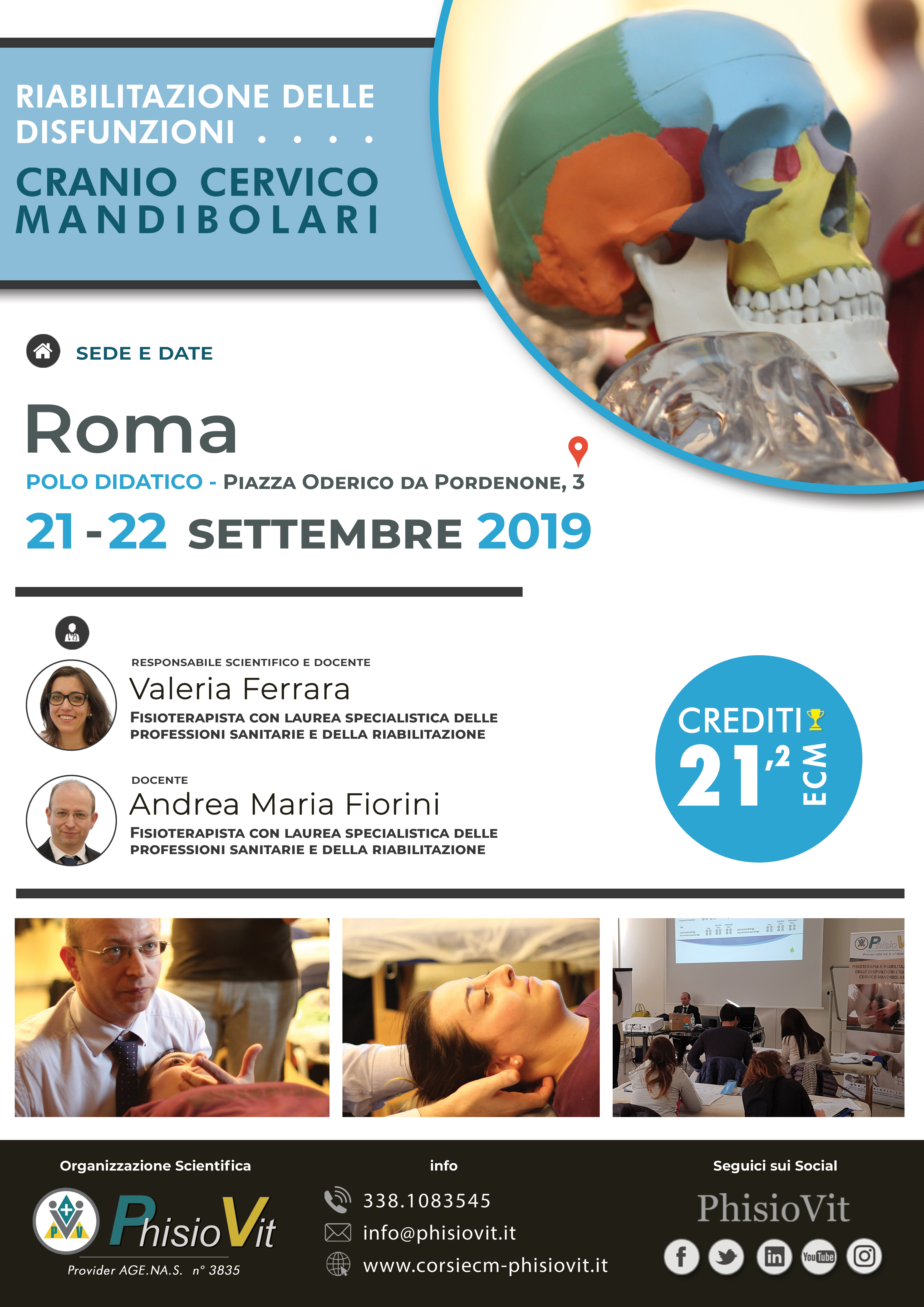 Questo corso è stato accuratamente progettato per affrontare tutti questi temi e si prefigge di mostrare quali sono i possibili quadri clinici che si possono presentare, l'importanza della collaborazione tra varie figure specialistiche quali fisioterapisti, odontoiatri, gnatologi, fisiatri, chirurghi maxillo facciali, otorinolaringoiatri e logopedisti ed il trattamento fisioterapico in fase acuta, sub-acuta e cronica, il tutto supportato da letteratura scientifica. Nelle oltre dieci ore riservate alle sessioni pratiche, vengono valutati e trattati i vari distretti del complesso cranio cervico mandibolare, nonché i disturbi della postura e le varie complicanze associate a queste disfunzioni attingendo dalle più attuali tecniche fisioterapiche, osteopatiche e manipolative, scegliendo le più adatte al trattamento di questa singolare disfunzione sempre più diffusa ed ancora poco conosciuta.
