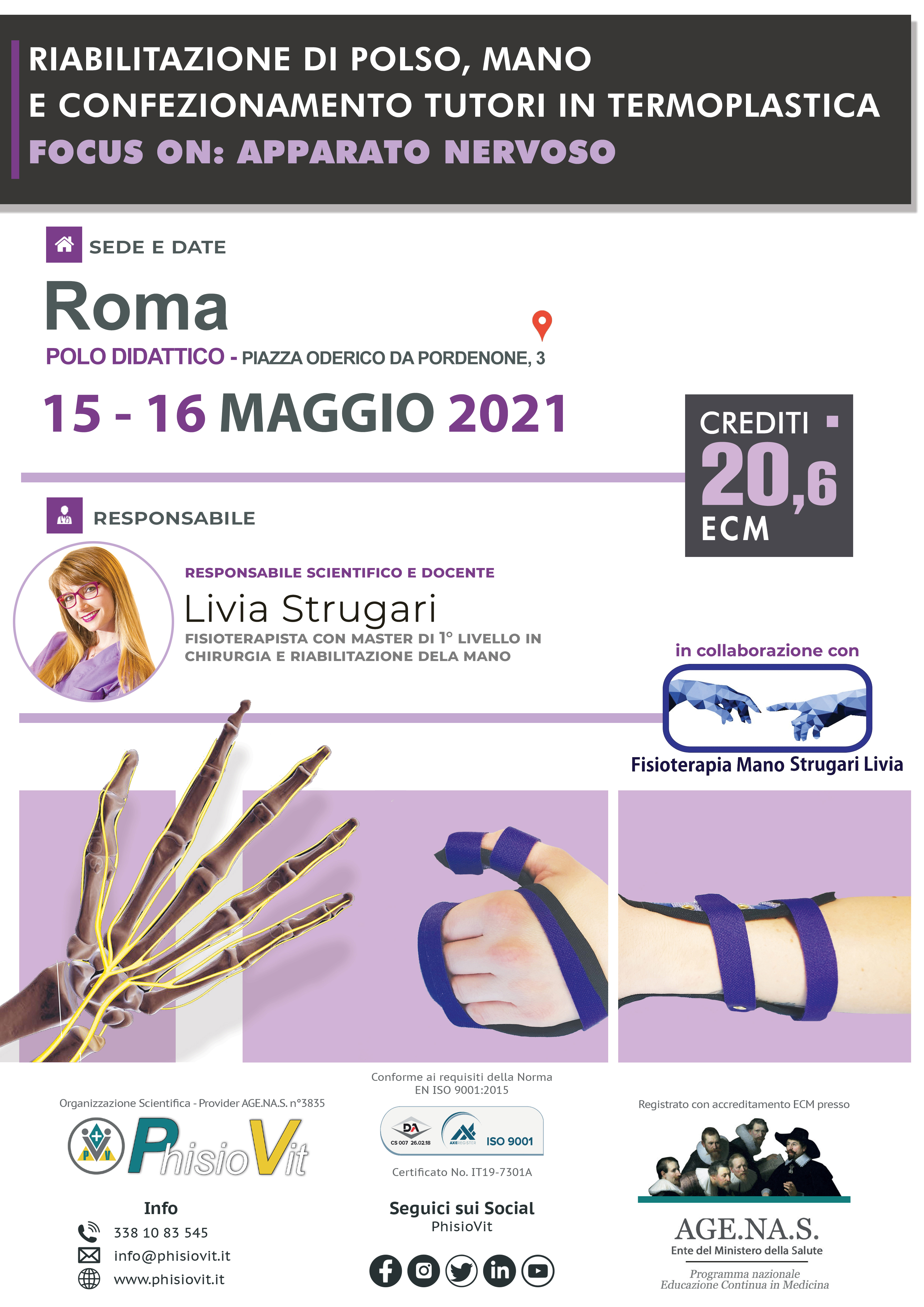 Questo corso, specifico sulla riabilitazione di polso e mano, è stato accuratamente progettato con il preciso fine di istruire i professionisti dell'area riabilitativa sul trattamento conservativo delle patologie compressive dei nervi. La riabilitazione deve essere mirata e tempestiva, al fine di evitare che una condizione normalmente solo temporanea e risolvibile, non evolva in un danno progressivo, persistente ed irreparabile. L'utilizzo di un tutore fatto su misura è una soluzione che permette, immobilizzando le articolazioni a monte e a valle della compressione, di ridurre la componente articolare di costrizione, lasciando il nervo più libero e decompresso nel tempo in cui il tutore viene indossato. A tale trattamento viene associato un percorso di terapia occupazionale e di riabilitazione: quest'ultima prevede tecniche specifiche che attingono da discipline come la terapia manuale, la neurodinamica, le tecniche di mobilizzazione etc. partendo dallo studio anatomico e biomeccanico della mano. Ampio respiro nella didattica viene dato inoltre alla nota sindrome dolorosa regionale complessa (algoneurodistrofia), sindrome di grande interesse in questo ambito.