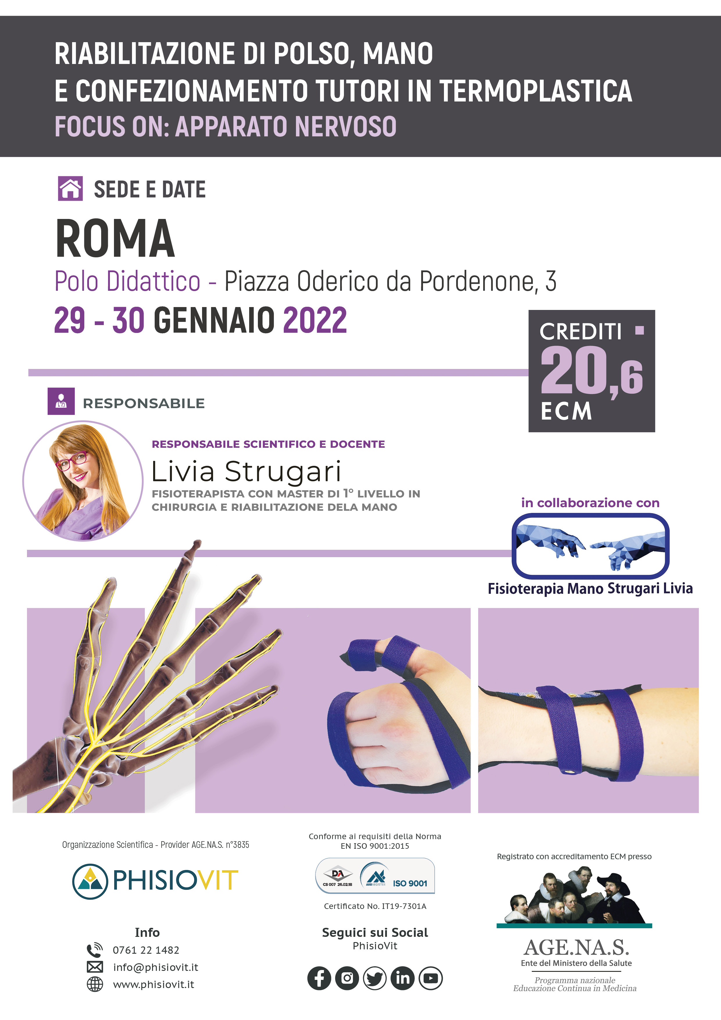 Questo corso, specifico sulla riabilitazione di polso e mano, è stato accuratamente progettato con il preciso fine di istruire i professionisti dell'area riabilitativa sul trattamento conservativo delle patologie compressive dei nervi. La riabilitazione deve essere mirata e tempestiva, al fine di evitare che una condizione normalmente solo temporanea e risolvibile, non evolva in un danno progressivo, persistente ed irreparabile. L'utilizzo di un tutore fatto su misura è una soluzione che permette, immobilizzando le articolazioni a monte e a valle della compressione, di ridurre la componente articolare di costrizione, lasciando il nervo più libero e decompresso nel tempo in cui il tutore viene indossato. A tale trattamento viene associato un percorso di terapia occupazionale e di riabilitazione: quest'ultima prevede tecniche specifiche che attingono da discipline come la terapia manuale, la neurodinamica, le tecniche di mobilizzazione etc. partendo dallo studio anatomico e biomeccanico della mano. Ampio respiro nella didattica viene dato inoltre alla nota sindrome dolorosa regionale complessa (algoneurodistrofia), sindrome di grande interesse in questo ambito.