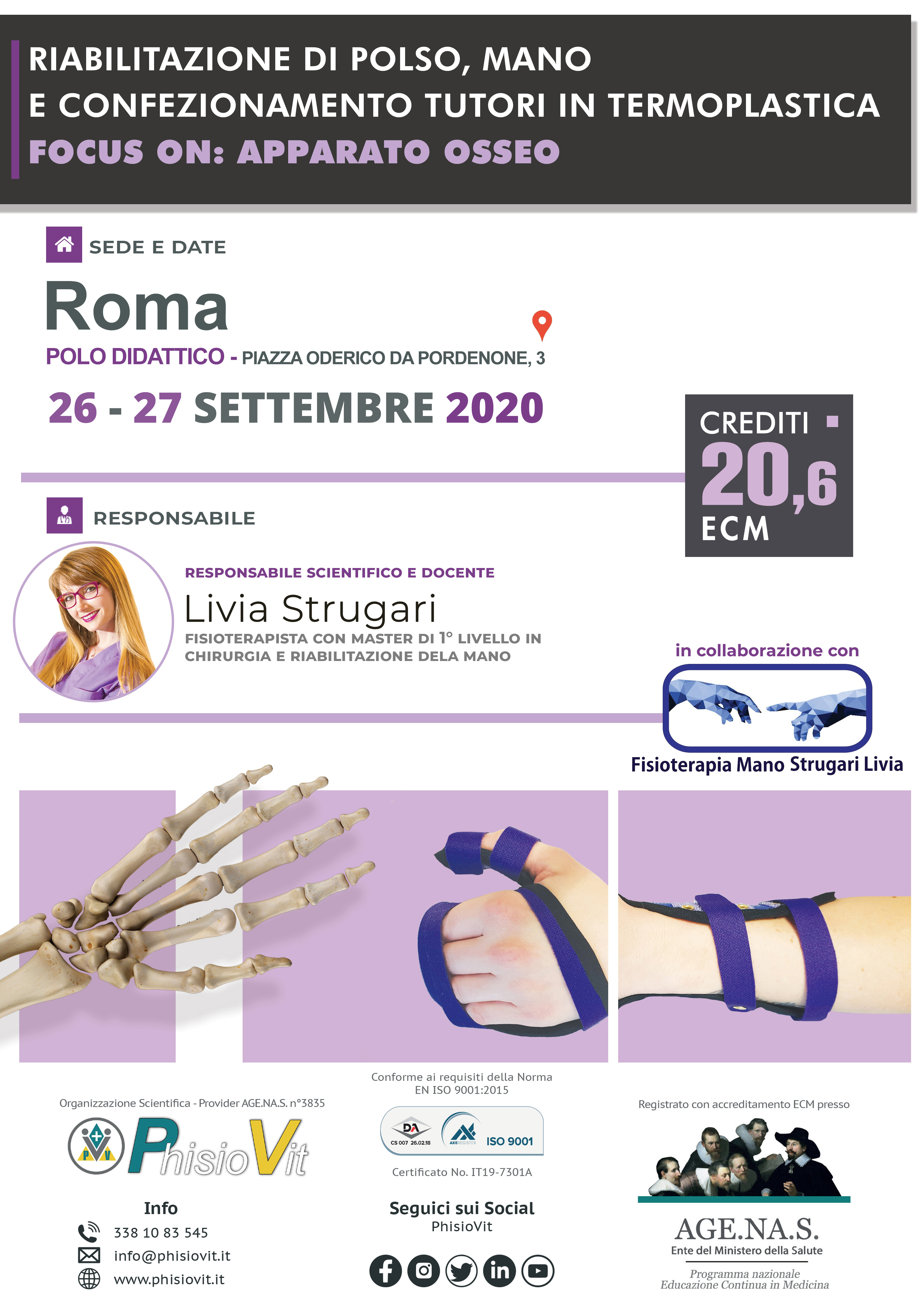 Questo evento si propone di fornire un panorama dei trattamenti fisioterapici, riabilitativi e conservativi delle patologie ossee della mano, a cui segue una parte pratica di laboratorio, dove ogni singolo partecipante apprende non solo gli esercizi e le più comuni tecniche riabilitative ma anche l'arte del confezionamento dei tutori. I contenuti del corso comprendono nozioni di anatomia, la conoscenza dei meccanismi patogenetici delle patologie ossee più frequenti della mano, le procedure di valutazione, le metodiche di trattamento mediante tecniche manuali, splinting, autotrattamento, terapia occupazionale, taping, coban ed esercizio terapeutico.