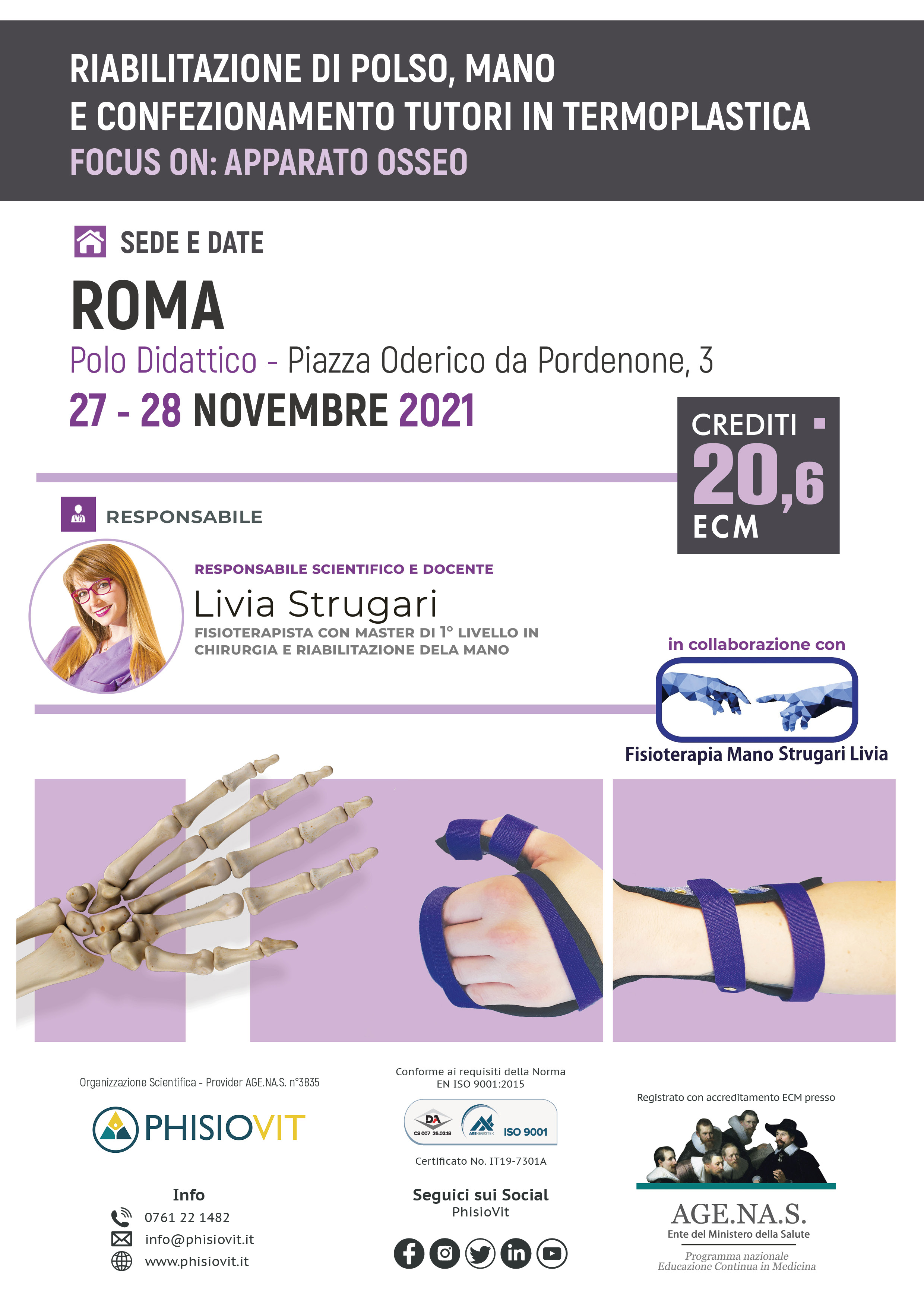 Questo evento si propone di fornire un panorama dei trattamenti fisioterapici, riabilitativi e conservativi delle patologie ossee della mano, a cui segue una parte pratica di laboratorio, dove ogni singolo partecipante apprende non solo gli esercizi e le più comuni tecniche riabilitative ma anche l'arte del confezionamento dei tutori. I contenuti del corso comprendono nozioni di anatomia, la conoscenza dei meccanismi patogenetici delle patologie ossee più frequenti della mano, le procedure di valutazione, le metodiche di trattamento mediante tecniche manuali, splinting, autotrattamento, terapia occupazionale, taping, coban ed esercizio terapeutico.