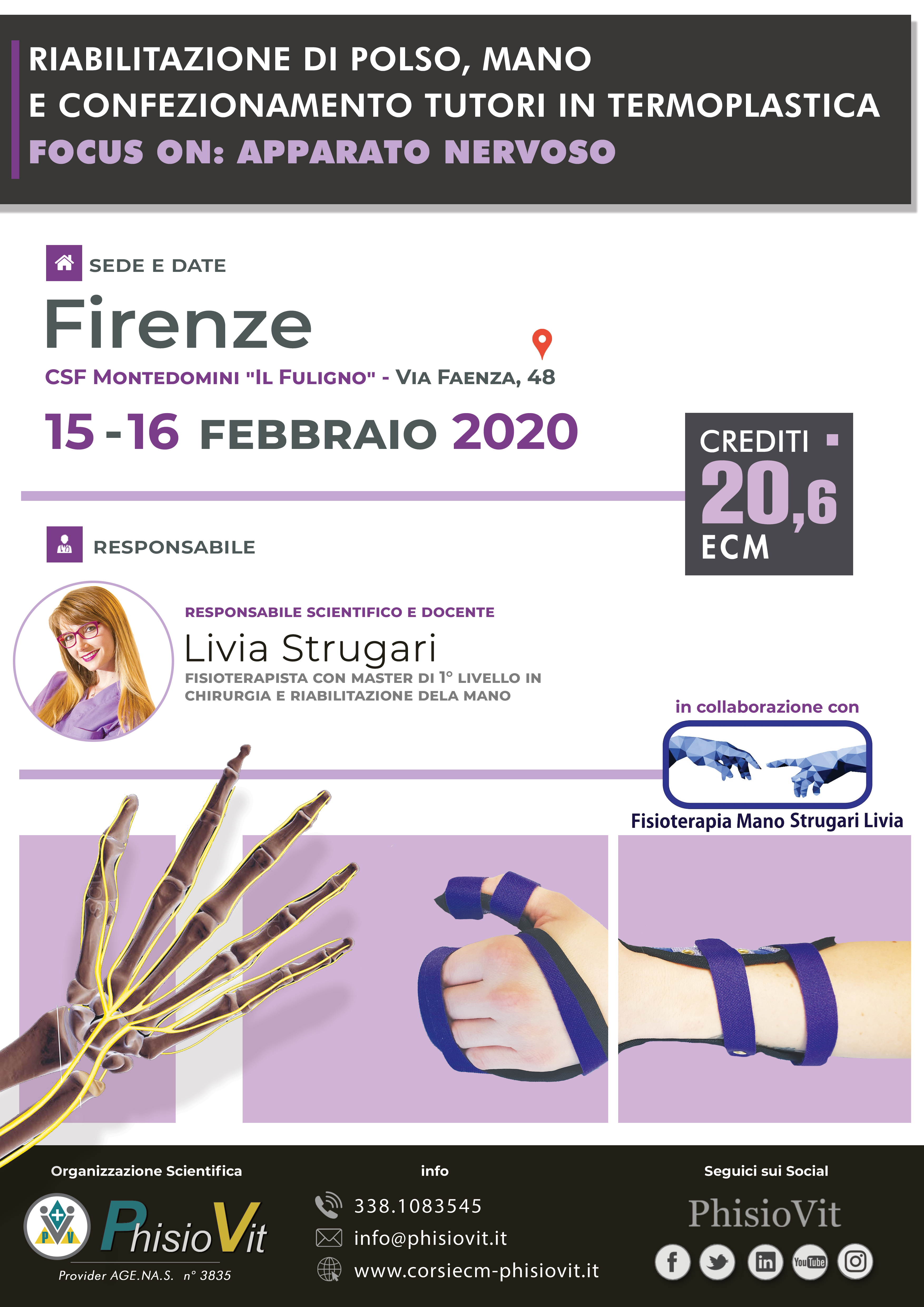 Questo corso, specifico sulla riabilitazione di polso e mano, è stato accuratamente progettato con il preciso fine di istruire i professionisti dell'area riabilitativa sul trattamento conservativo delle patologie compressive dei nervi. La riabilitazione deve essere mirata e tempestiva, al fine di evitare che una condizione normalmente solo temporanea e risolvibile, non evolva in un danno progressivo, persistente ed irreparabile. L'utilizzo di un tutore fatto su misura è una soluzione che permette, immobilizzando le articolazioni a monte e a valle della compressione, di ridurre la componente articolare di costrizione, lasciando il nervo più libero e decompresso nel tempo in cui il tutore viene indossato. A tale trattamento viene associato un percorso di terapia occupazionale e di riabilitazione: quest'ultima prevede tecniche specifiche che attingono da discipline come la terapia manuale, la neurodinamica, le tecniche di mobilizzazione etc. partendo dallo studio anatomico e biomeccanico della mano. Ampio respiro nella didattica viene dato inoltre alla nota sindrome dolorosa regionale complessa (algoneurodistrofia), sindrome di grande interesse in questo ambito.