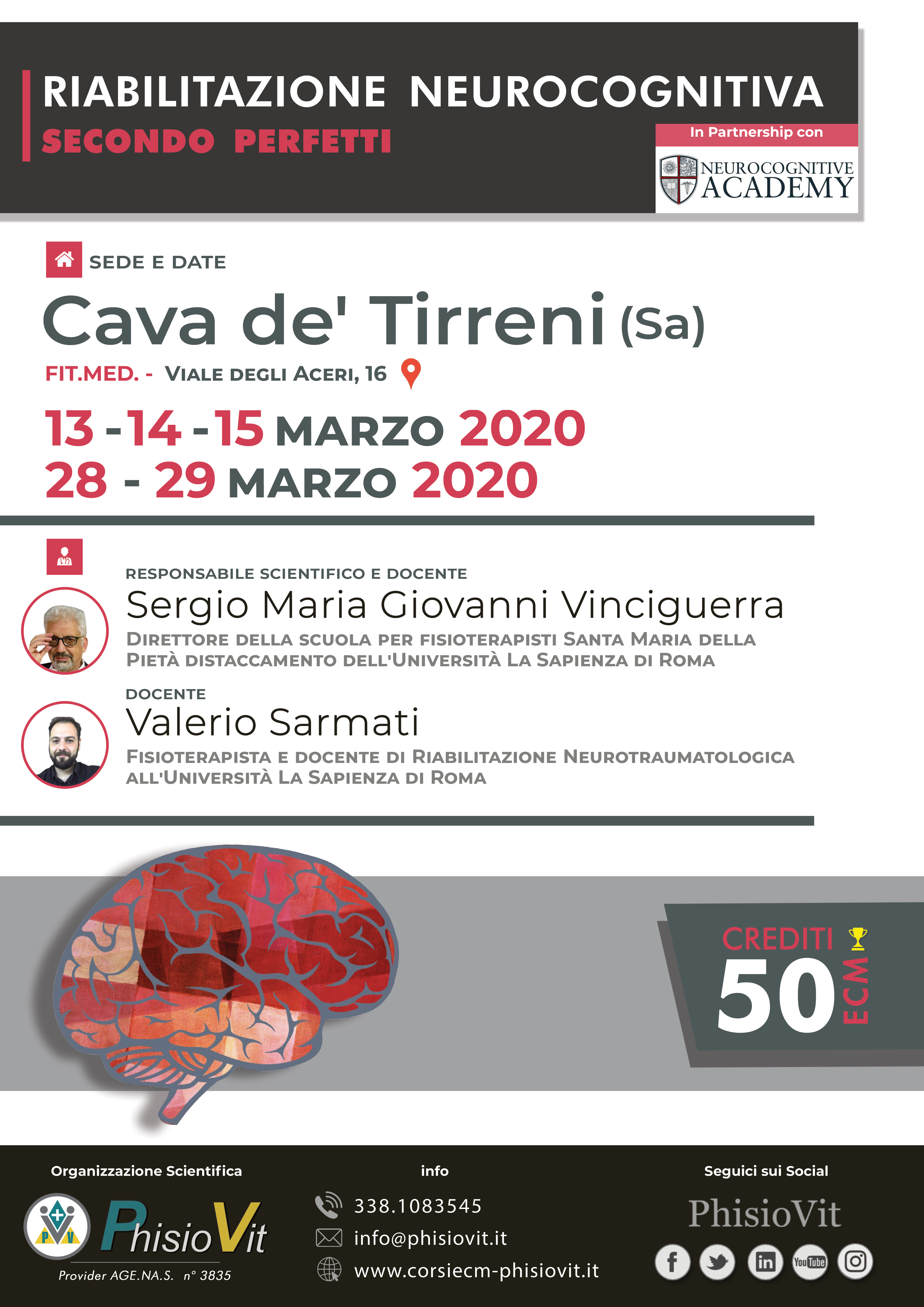 Il corso, della durata di cinque giorni non consecutivi (13-14-15 marzo e 28-29 marzo 2020 "Riabilitazione Neurocognitiva secondo Perfetti"), verrà tenuto dai docenti Sergio Maria Giovanni Vinciguerra e Valerio Sarmati. Il Dr. Sergio Maria Giovanni Vinciguerra già direttore della scuola per fisioterapisti Santa Maria della Pietà distaccamento dell'Università La Sapienza di Roma. Studioso della riabilitazione neurocognitiva fin dai primi studi del Prof. Perfetti, ha formato nella sua carriera di docente centinaia di fisioterapisti infondendo loro un sempre costante spirito neurocognitivo. Il Dr. Valerio Sarmati è fisioterapista e docente di riabilitazione neurotraumatologica all'Università La Sapienza di Roma distaccamento Santa Maria della Pietà. Pioniere della teleriabilitazione neurocognitiva, ha partecipato alla diffusione della riabilitazione neurocognitiva in Italia e nel mondo. Gli orari andranno dalle 8.30 alle 17.30 per tutte e cinque le giornate, con due pause caffè di quindici minuti alle 10.30 e alle 15.30 e una pausa pranzo di un'ora alle 13.00.
