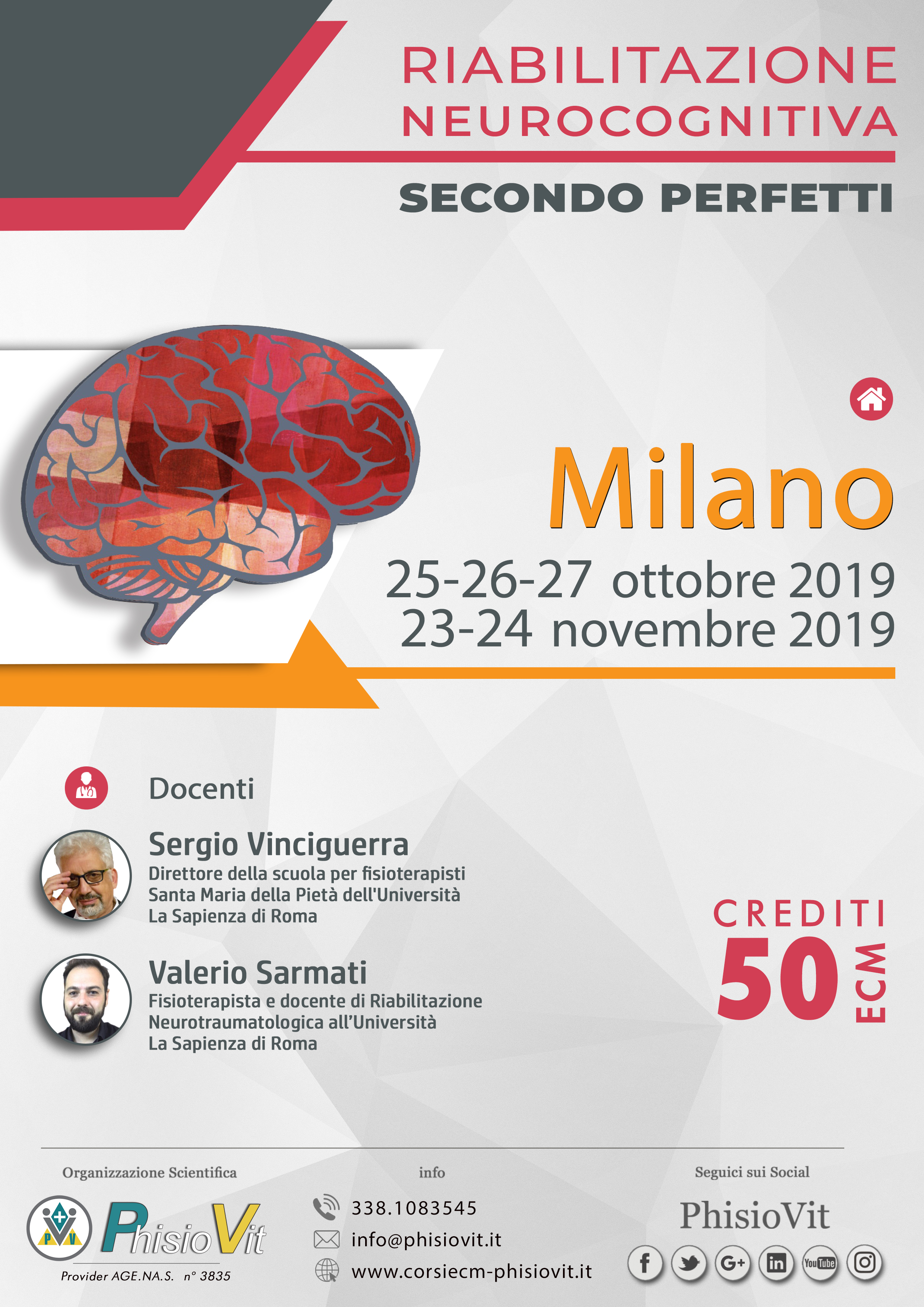 Il corso, della durata di cinque giorni non consecutivi (25-26-27 ottobre e 23-24 novembre "Riabilitazione Neurocognitiva secondo Perfetti"), verrà tenuto dai docenti Sergio Maria Giovanni Vinciguerra e Valerio Sarmati. Il Dr. Sergio Maria Giovanni Vinciguerra già direttore della scuola per fisioterapisti Santa Maria della Pietà distaccamento dell'Università La Sapienza di Roma. Studioso della riabilitazione neurocognitiva fin dai primi studi del Prof. Perfetti, ha formato nella sua carriera di docente centinaia di fisioterapisti infondendo loro un sempre costante spirito neurocognitivo. Il Dr. Valerio Sarmati è fisioterapista e docente di riabilitazione neurotraumatologica all'Università La Sapienza di Roma distaccamento Santa Maria della Pietà. Pioniere della teleriabilitazione neurocognitiva, ha partecipato alla diffusione della riabilitazione neurocognitiva in Italia e nel mondo. Gli orari andranno dalle 8.30 alle 17.30 per tutte e cinque le giornate, con due pause caffè di quindici minuti alle 10.30 e alle 15.30 e una pausa pranzo di un'ora alle 13.00.