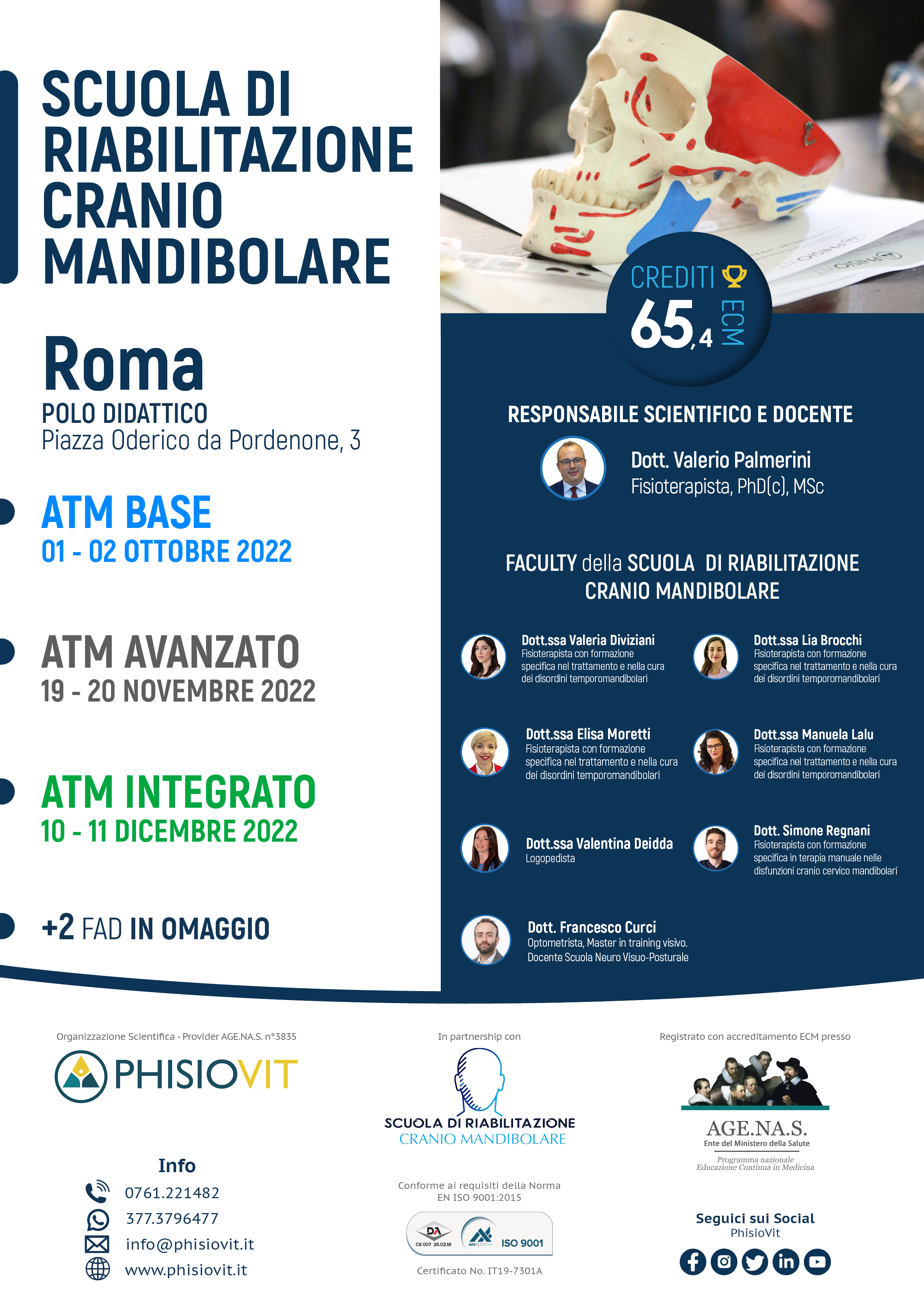 Scuola di Riabilitazione Cranio Mandibolare è un progetto didattico che mira a formare i professionisti dell'area riabilitativa e rieducativa nella fisioterapia e nella riabilitazione dei disordini dell'articolazione temporomandibolare (DTM) e delle disfunzioni cranio cervico mandibolari (DCCM). Include un pacchetto promozionale di cinque corsi ed eroga complessivamente 65,4 crediti ECM. I cinque eventi inclusi sono: "Riabilitazione Cranio Mandibolare - ATM Base", 21,8 crediti ECM, Roma, 1-2 ottobre 2022; "Riabilitazione Cranio Mandibolare - ATM Avanzato", 21,8 crediti ECM, Roma, 19-20 novembre 2022; "Riabilitazione Cranio Mandibolare - ATM Integrato - Lingua e Ioide", 21,8 crediti ECM, Roma, 10-11 dicembre 2022 e due corsi FAD asincroni che si possono svolgere da casa dal titolo "Anatomia dell'ATM" e "I Nervi Cranici", estremamente utili questi ultimi corsi a distanza per prepararsi al meglio alla serie di eventi in aula. Questi ultimi due eventi FAD vengono rilasciati a cura della segreteria di PhisioVit ai discenti regolarmente iscritti al pacchetto didattico poco prima dell'inizio delle lezioni residenziali.