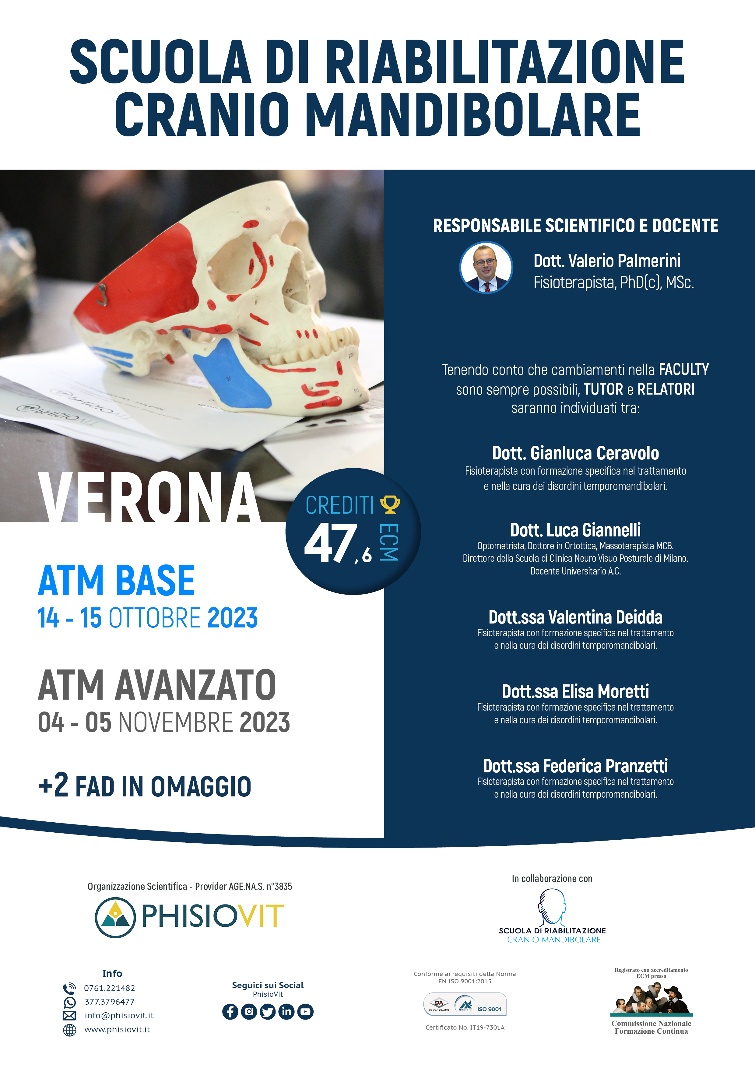 Scuola di Riabilitazione Cranio Mandibolare è un progetto didattico blended che mira a formare i professionisti dell'area riabilitativa e rieducativa nella fisioterapia e nella riabilitazione dei disordini dell'articolazione temporomandibolare (DTM) e delle disfunzioni cranio cervico mandibolari (DCCM). Include un pacchetto promozionale di quattro corsi ed eroga complessivamente 47,6 crediti ECM. I quattro eventi inclusi sono: "Riabilitazione Cranio Mandibolare - ATM Base", 21,8 crediti ECM, Verona, 14-15 ottobre 2023; "Riabilitazione Cranio Mandibolare - ATM Avanzato", 21,8 crediti ECM, Verona, 4-5 novembre 2023 e due corsi FAD asincroni che si possono svolgere a distanza dal titolo "Anatomia dell'ATM", 2 crediti ECM e "I Nervi Cranici", 2 crediti ECM, estremamente utili questi ultimi per prepararsi al meglio alla serie di eventi in aula. Questi due corsi FAD vengono rilasciati a cura della segreteria di PhisioVit ai discenti regolarmente iscritti al pacchetto didattico poco prima dell'inizio delle lezioni residenziali.