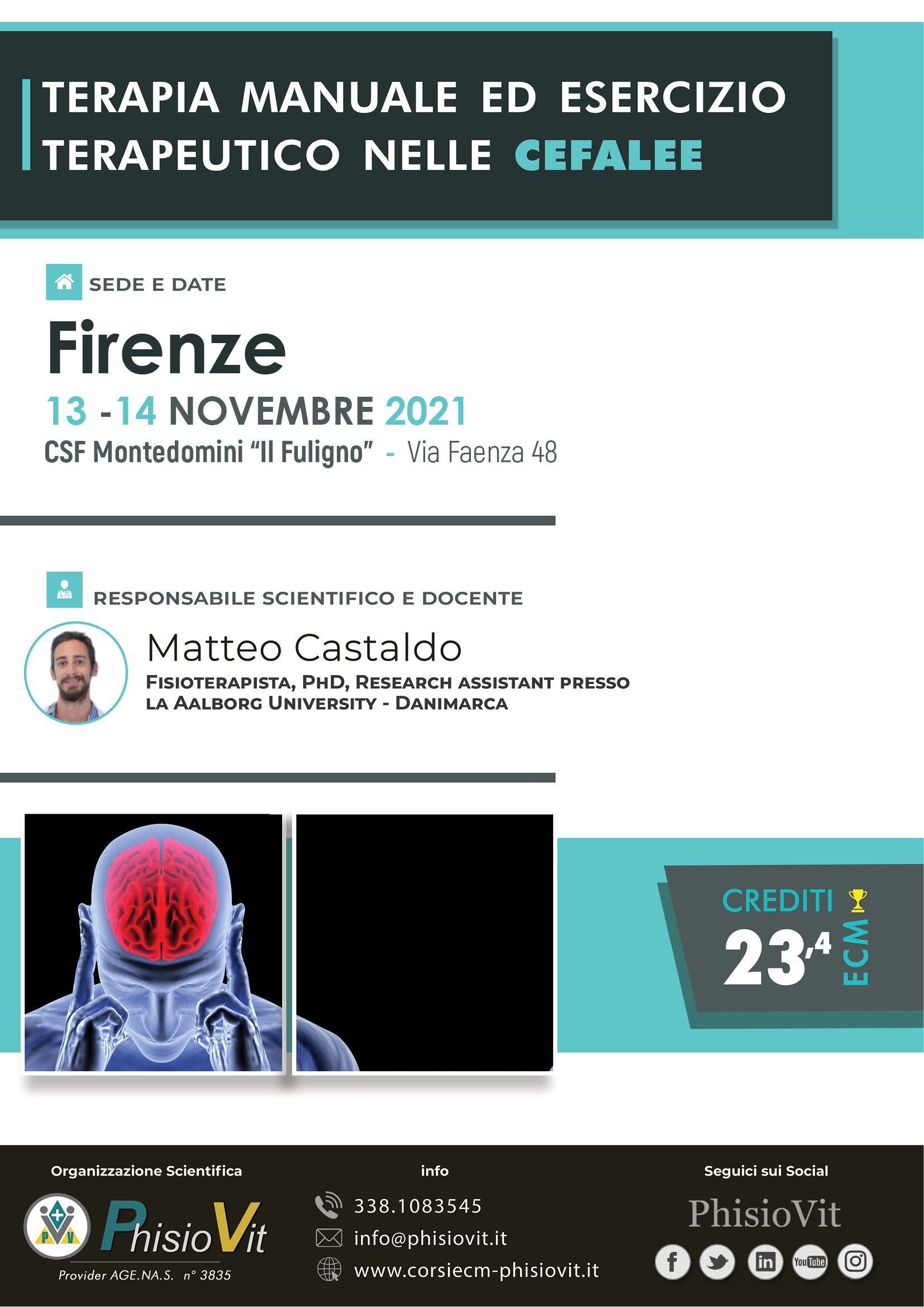 Il corso "Terapia manuale ed esercizio terapeutico nelle cefalee" si propone di fornire al discente le più aggiornate nozioni teoriche ed i più specifici strumenti pratici per l'inquadramento diagnostico e la gestione terapeutica delle cefalee, tra cui: