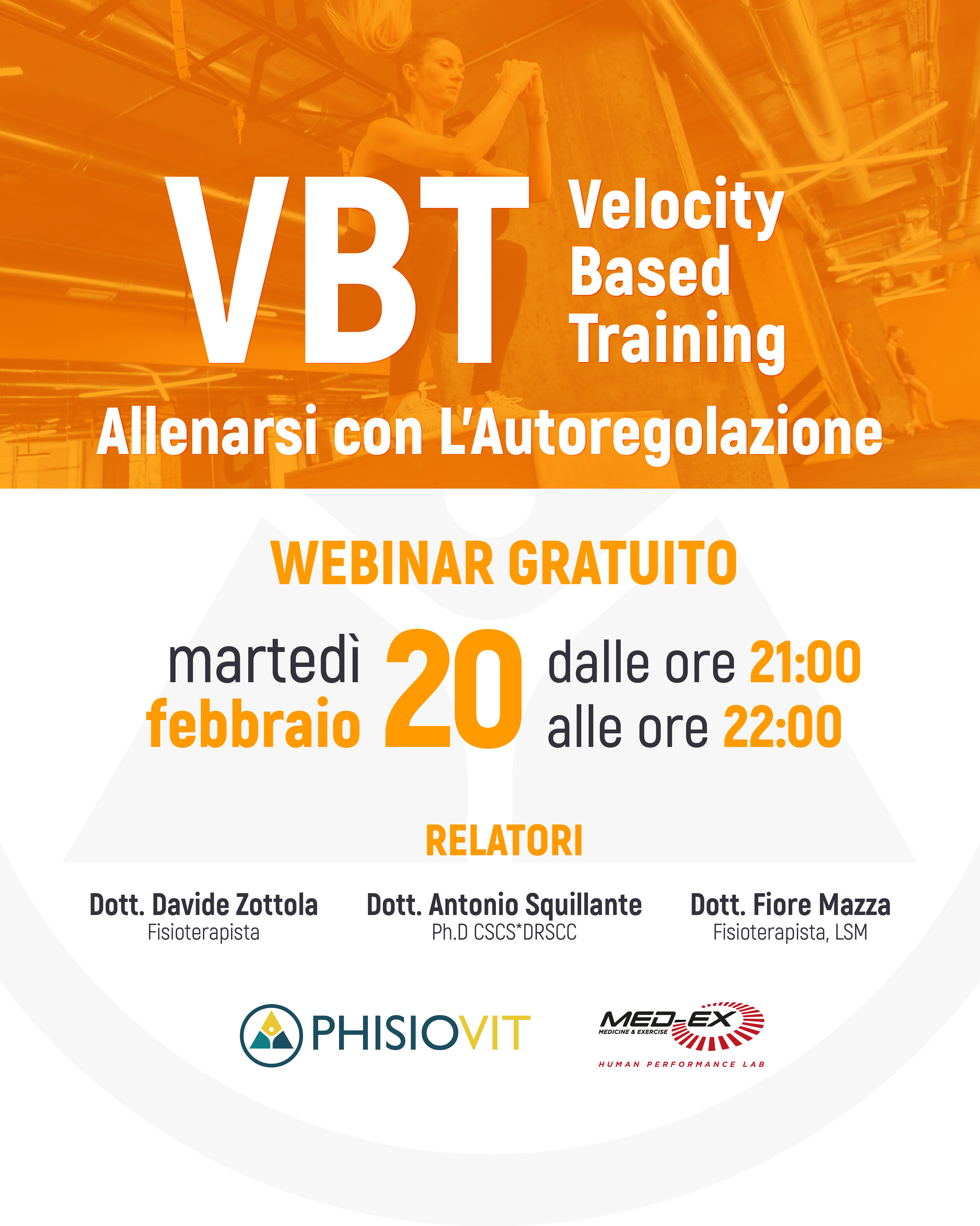 Il VBT si basa sulla curva di Hill che mette in relazione la forza con la velocità e mostra come alti livelli di forza, come un carico spostato, corrispondono a basse velocità di spostamento dello stesso. Viceversa bassi carichi vengono spostati con elevata velocità. Questo webinar ha come obiettivo quello di fornire a preparatori atletici, specialisti del movimento, fisioterapisti e medici nozioni teoriche e pratiche per utilizzare il velocity based training in programmi di allenamento per la forza e per il recupero funzionale. Verranno trattati in maniera completa ed esaustiva sia i protocolli di valutazione funzionale che i test necessari per ideare protocolli di allenamento individualizzati, i quali devono tenere in considerazione non solo gli obiettivi di un atleta e/o di un paziente ma anche le differenze individuali e un eventuale deficit di forza e/o velocità. Ma come mettere in relazione la forza con la velocità? E come utilizzare i protocolli di valutazione funzionale per creare protocolli di allenamento personalizzati? Infine, come individuare, distinguere e trattare i deficit di forza e/o di velocità? In questo webinar risponderemo a queste e ad altre domande grazie al Dott. Antonio Squillante, Ph.D CSCS*DRSCC, docente ricercatore presso la University of Southern California, al Dott. Davide Zottola, fisioterapista, M.Sc., professore a contratto presso l'Università Cattolica del Sacro Cuore e al Dott. Fiore Mazza, fisioterapista, laureato in scienze motorie, osteopata DO.