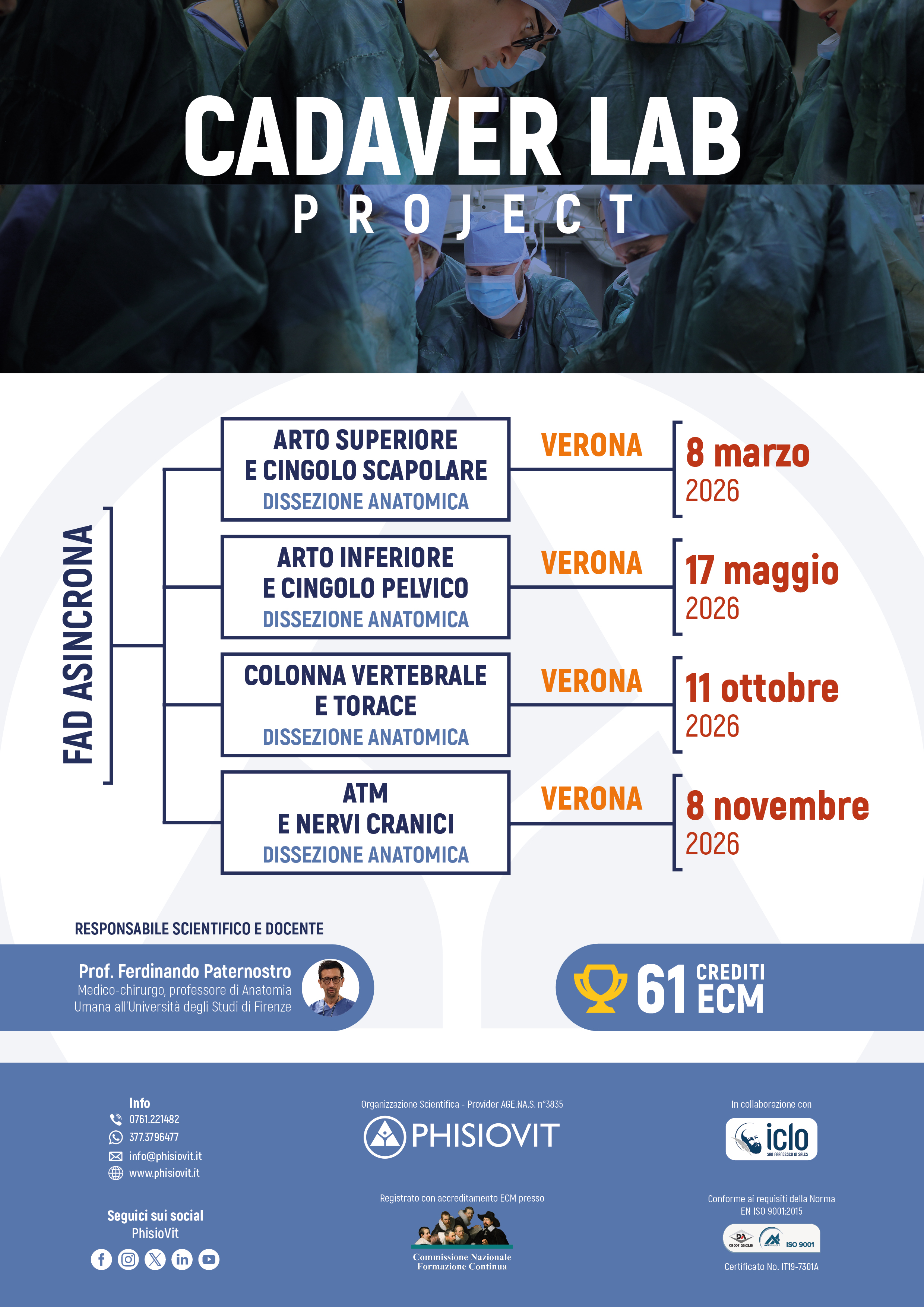Cadaver Lab Project è un progetto didattico che mira a formare i professionisti dell'area medica, riabilitativa, rieducativa, sportiva e parasanitaria nello studio dell'anatomia umana attraverso la dissezione dell'arto superiore e del cingolo scapolare, dell'arto inferiore e del cingolo pelvico, della colonna vertebrale, del torace e dell'addome, dell'articolazione temporomandibolare e dei nervi cranici. Include un pacchetto promozionale di quattro corsi ed eroga complessivamente 61 crediti ECM. I quattro eventi inclusi sono: "Arto Superiore e Cingolo Scapolare: Dissezione Anatomica", 16 crediti ECM con giornata in presenza a Verona domenica 4 ottobre 2026; "Arto Inferiore e Cingolo Pelvico: Dissezione Anatomica", 15 crediti ECM con giornata in presenza a Verona domenica 11 ottobre 2026; "Colonna Vertebrale e Torace: Dissezione Anatomica", 15 crediti ECM, con giornata in presenza a Verona domenica 8 novembre 2026; "ATM e Nervi Cranici: Dissezione Anatomica", 15 crediti ECM, con giornata in presenza a Verona domenica 15 novembre 2026. Precedentemente alle lezioni presenziali, vengono anche rilasciati quattro corsi FAD su Biomeccanica della Spalla, Biomeccanica della Coxo Femorale, Fascia: dalla Forma alla Funzione e Un Approccio Funzionale e Clinico alla Neuroanatomia 1. Questa formazione asincrona e anticipatoria delle lezioni in presenza in aula settoria serve a introdurre gli argomenti, a studiare i principi cardine dell'anatomia, a recuperare concetti base di anatomia muscoloscheletrica e a garantire una prima preparazione allo studente attraverso un'interazione indiretta col docente in vista degli incontri in presenza nelle aule sede delle dissezioni anatomiche.
