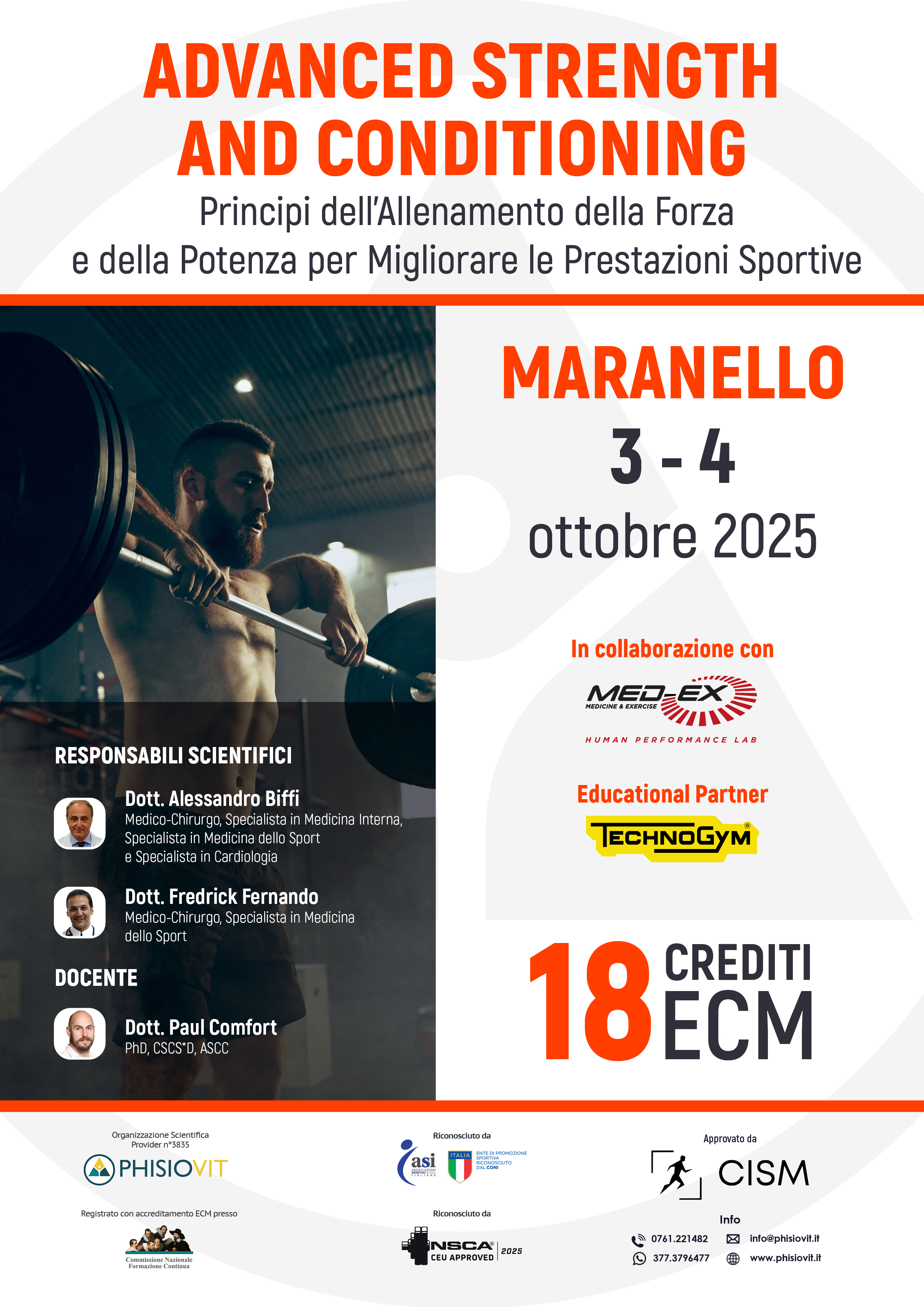 Il corso, della durata di due giornate consecutive (20-21 marzo 2026) Advanced Strength and Conditioning - Principi dell'Allenamento della Forza e della Potenza per Migliorare le Prestazioni Sportive, si svolgerà sotto la direzione scientifica del Dott. Alessandro Biffi, Medico-Chirurgo, Specialista in Medicina Interna, Specialista in Medicina dello Sport e Specialista in Cardiologia e del Dott. Fredrick Fernando, Medico-Chirurgo, Specialista in Medicina dello Sport. Il corpo docente è completato dal Dott. Paul Comfort, PhD, CSCS*D, ASCC. Il corso è tenuto in lingua inglese con traduzione consecutiva in italiano.