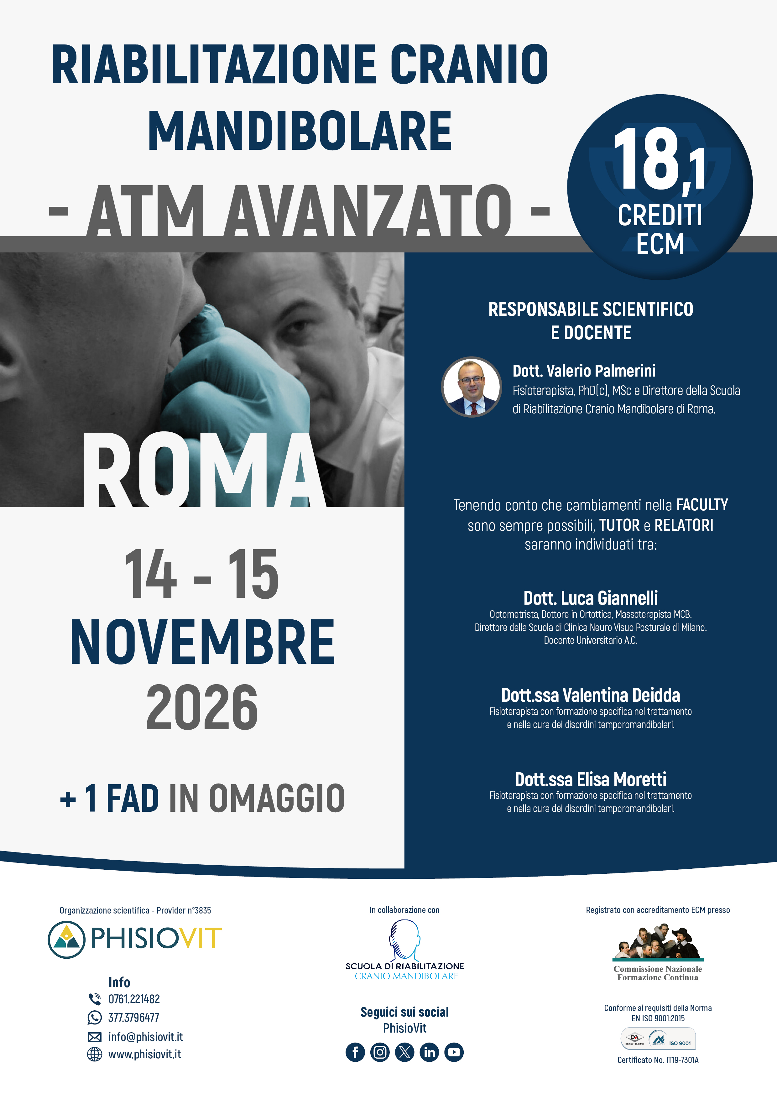 Il corso Riabilitazione Cranio Mandibolare - ATM Avanzato, della durata di due giorni consecutivi (14-15 novembre 2026), vede coincidere la responsabilità scientifica e la docenza nella persona del Dott. Valerio Palmerini, fisioterapista, PhD(c), MSc e Direttore della Scuola di Riabilitazione Cranio Mandibolare. L'assistenza alla docenza è completata dalla Dott.ssa Valentina Deidda, logopedista, dalla Dott.ssa Elisa Moretti, fisioterapista, entrambe con formazione specifica nel trattamento e nella cura dei disordini temporomandibolari, infine dal Dott. Luca Giannelli, optometrista, dottore in ortottica, massoterapista MCB. Direttore della Scuola di Clinica Neuro Visuo Posturale di Milano.
