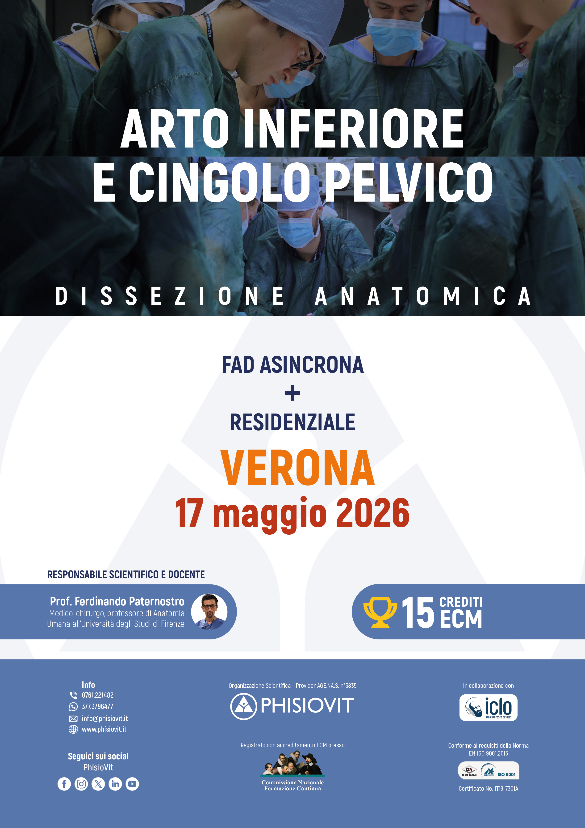 È indubbio che oggigiorno il professionista sanitario debba possedere una solida conoscenza anatomica dell'apparato muscolo scheletrico, al fine di saper orientare con maggiore cura e precisione il suo atto terapeutico. In questo corso, partendo dall'anatomia di superficie, passando per quella topografica e attraverso la dissezione su cadavere sotto la guida del proprio tutor, si evidenziano le diverse strutture con la possibilità per il partecipante di saggiarle e palparle (hands-on) al fine di comprenderne ubicazione, forma, rapporti e avere così una migliore percezione della tridimensionalità del corpo umano. I discenti possono effettuare differenti manovre e tecniche sul pezzo anatomico, palpandolo, evidenziando così la risposta articolare, muscolare e biomeccanica delle strutture coinvolte. In questo corso viene effettuata la dissezione del cingolo pelvico, dell'arto inferiore e della sua parte libera col preciso fine di evidenziare le strutture posteriori e quelle anteriori.