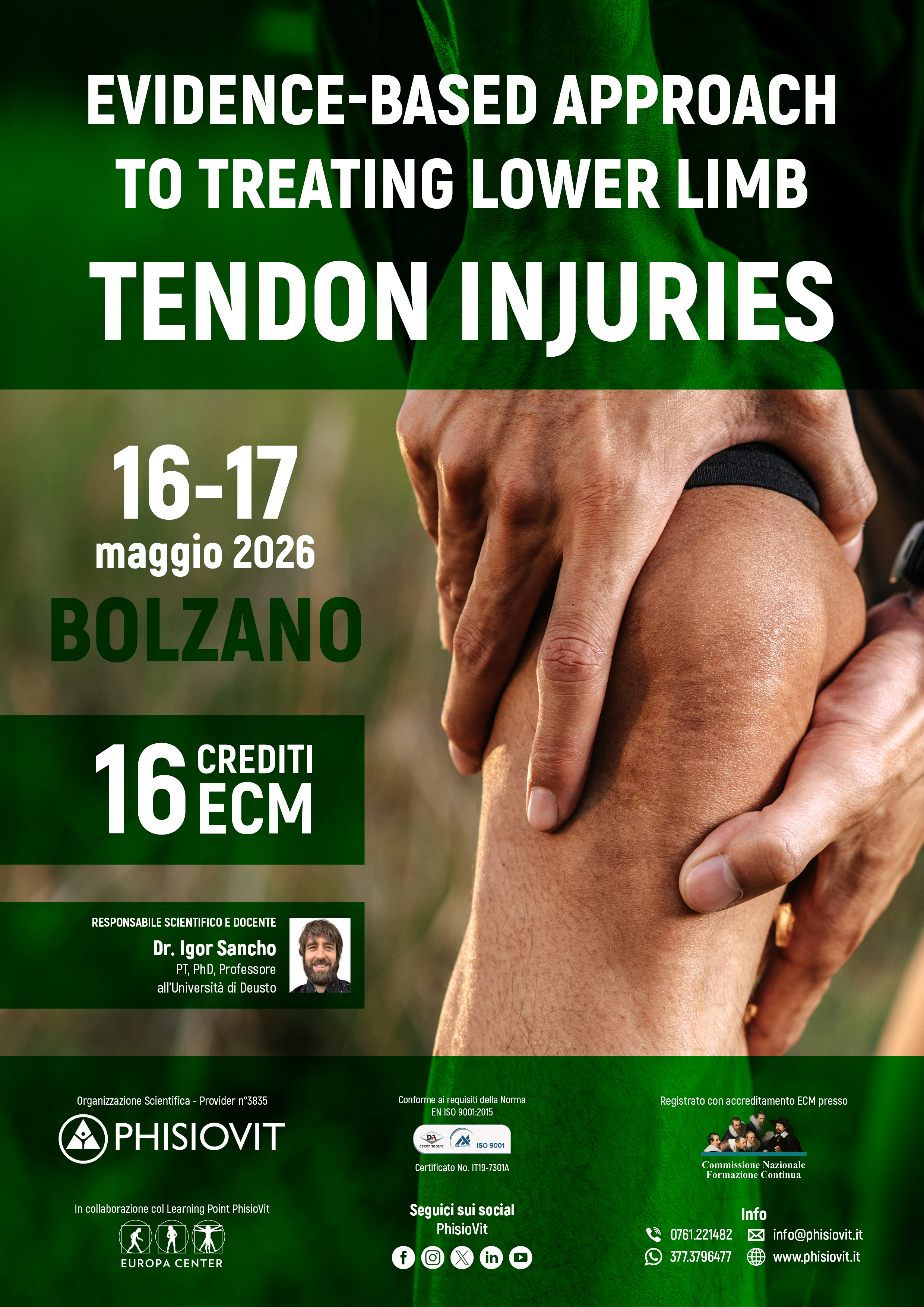 Questo corso di due giorni dal titolo "Evidence-Based approach to Treating Lower Limb Tendon Injuries" specifico per la gestione delle patologie tendinee dell'arto inferiore, mira a fornire ai clinici un approccio aggiornato basato su prove ed evidenze per valutare e trattare le più comuni tendinopatie, lesioni parziali e rotture complete dei tendini degli arti inferiori, includendo anche gli aspetti legati alla riabilitazione post-chirurgica, argomento spesso poco discusso durante i corsi di aggiornamento di educazione continua in medicina. Durante la formazione sono previste lezioni su diagnosi differenziale, valutazione, prognosi, trattamenti basati sull'evidenza, monitoraggio del carico e test indicatori; sono incluse le sessioni pratiche di gestione essenziale, anche in relazione alle attuali strategie di gestione non essenziale, per sviluppare una serie completa di strumenti clinici con il preciso fine di affrontare tutte le patologie a carico dei tendini. Un corso in ultima analisi di primo livello rivolto a medici, fisioterapisti, clinici e studenti interessati a approfondire le evidenze più attuali per trattare gli atleti, ma anche i pazienti più sedentari con lesioni a carico dei tendini degli arti inferiori. Un evento infine che offre ampi laboratori pratici per rendere i partecipanti capaci di implementare i principi appresi dal giorno successivo alle lezioni per l'allenamento dei propri pazienti, per gli sportivi professionisti interessati da tendinopatie stagionali, fino alla popolazione generale in fase di riabilitazione con o senza intervento chirurgico. Tutto questo viene trattato con fondamenti teorici e scientifici durante due giorni di formazione unica, intensa e dinamica.