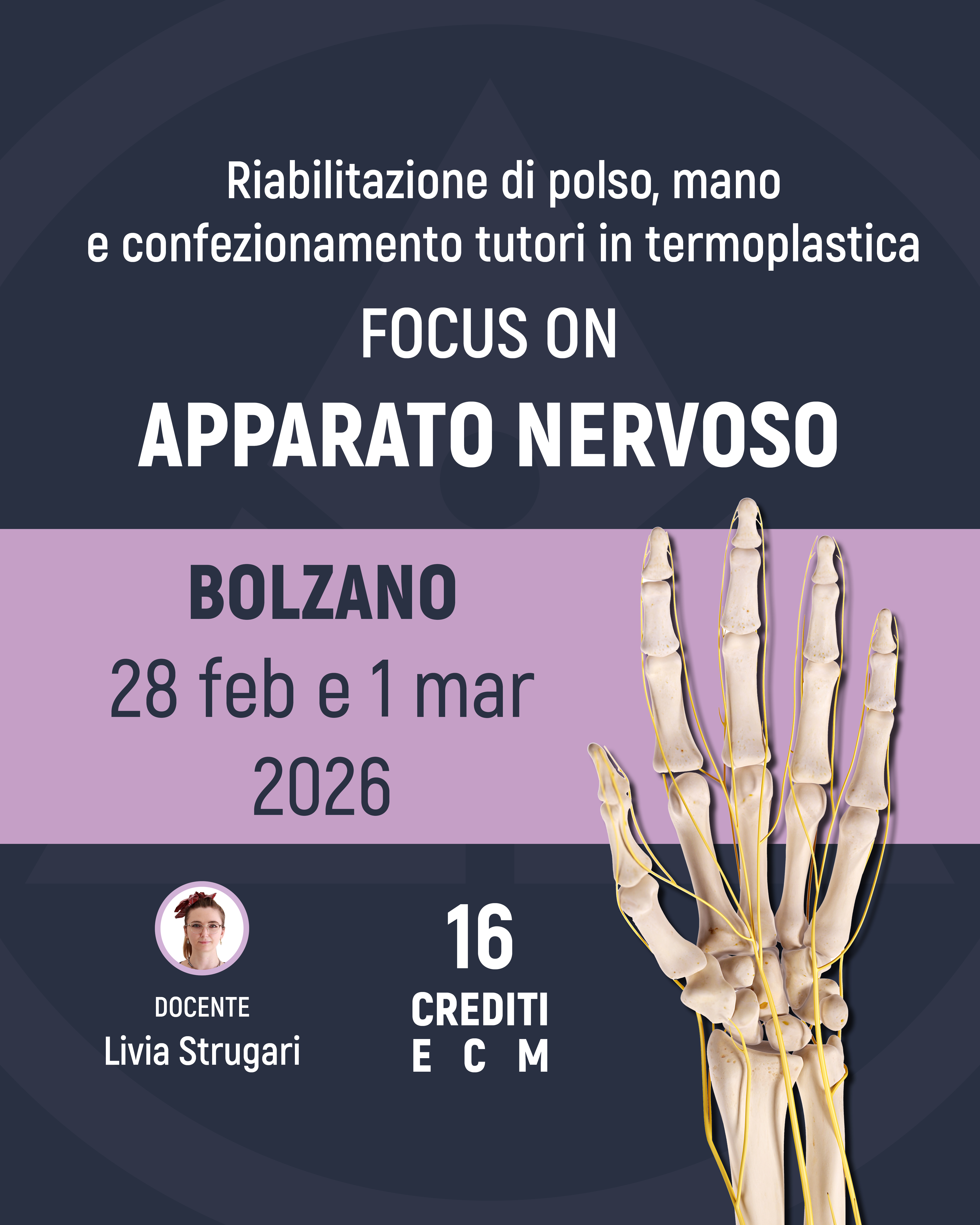 Il corso, della durata di due giorni consecutivi (28 febbraio - 1 marzo 2026 Riabilitazione di Polso, Mano e Confezionamento Tutori in Termoplastica. Focus On: Apparato Nervoso), è tenuto dalla Dott.ssa Livia Andreea Strugari, responsabile scientifico e docente, fisioterapista specializzata in riabilitazione di mano, polso e gomito con Master di I° livello in Chirurgia e Riabilitazione della Mano conseguito presso l'Università degli Studi di Milano. Gli orari vanno dalle 9.00 alle 18.00 il primo giorno e dalle 9.00 alle 17.00 il secondo giorno, con due pause caffè di quindici minuti alle 11.00 e alle 16.00 e una pausa pranzo di un'ora alle 13.00.