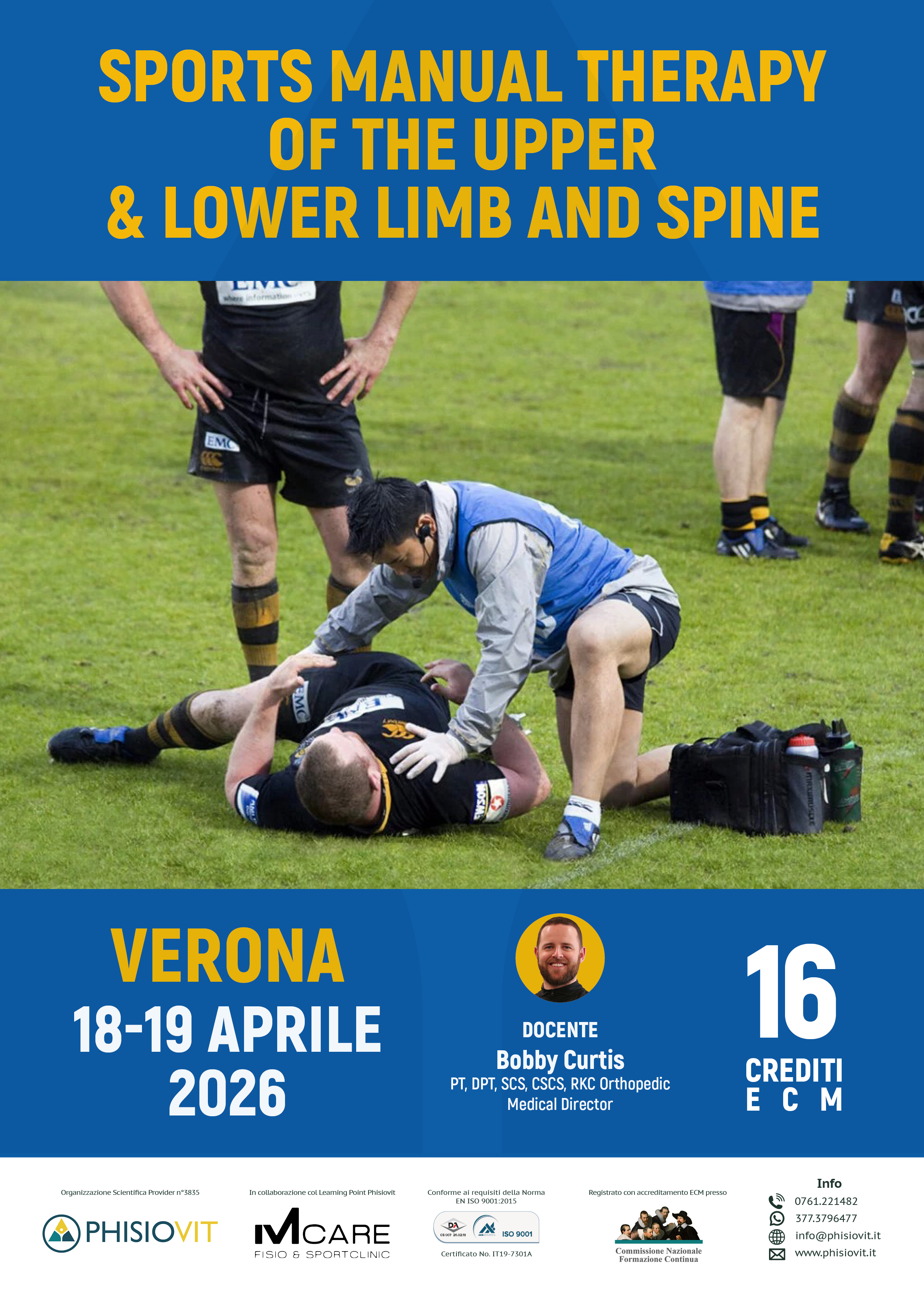 Il corso Sports Manual Therapy of the Upper Limb, Lower Limb and Spine, della durata di due giorni consecutivi (18-19 aprile 2026) è tenuto da Bobby Curtis PT, DPT, SCS, CSCS, RKC, Orthopedic Medical Director-Partner at Vista PT & Sports Medicine. A supporto dell'insegnamentio, in qualità di co-docenti, saranno presenti anche Chelsea Petska, PT, DPT, SCS e Christopher Riley Ratliff, PT, DPT, SCS, CSCS, TSACF. La lingua è l'inglese con traduzione consecutiva in italiano, sono previsti traduttori e assistenti alla docenza in aula perché il discente abbia la migliore esperienza didattica possibile. Gli orari vanno dalle 9.00 alle 18.00 per entrambe le giornate di corso, sono previste due pause caffè a metà mattina e metà pomeriggio e una pausa pranzo di un'ora.