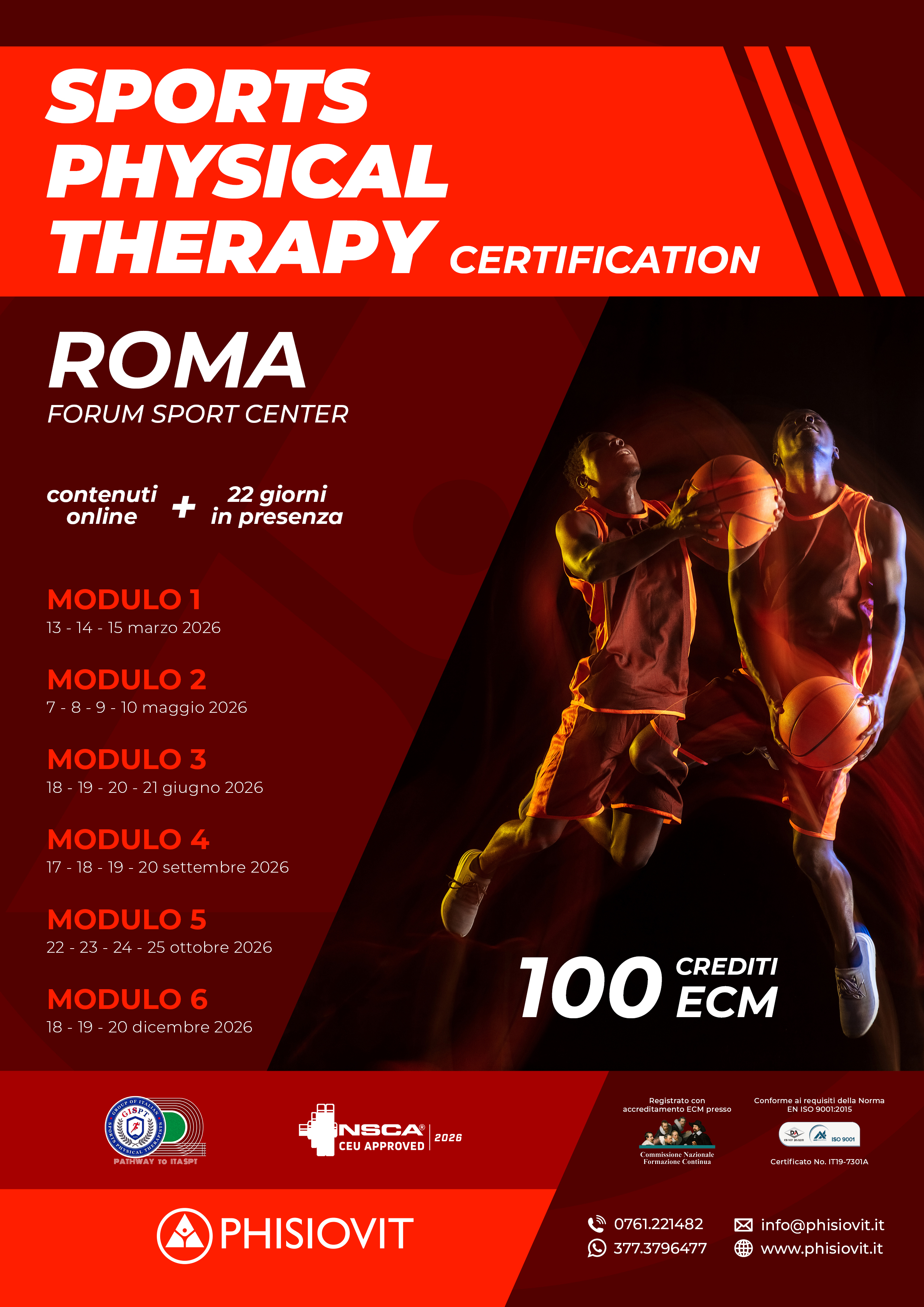 Il corso, della durata di ventidue giorni residenziali non consecutivi (Sports Physical Therapy Certification 13-14-15 marzo, 7-8-9-10 maggio, 18-19-20-21 giugno, 17-18-19-20 settembre, 22-23-24-25 ottobre e 18-19-20 dicembre 2026) oltre a cinque moduli online, riconosce la responsabilità scientifica nel Dott. Sebastiano Nutarelli, PhD Candidate, MS Biomechanics, Sports PT, EOC Clinical Researcher, Sports Rehab and EUKAF Center co-founder. Di seguito è possibile consultare il programma delle lezioni e il corpo docente.