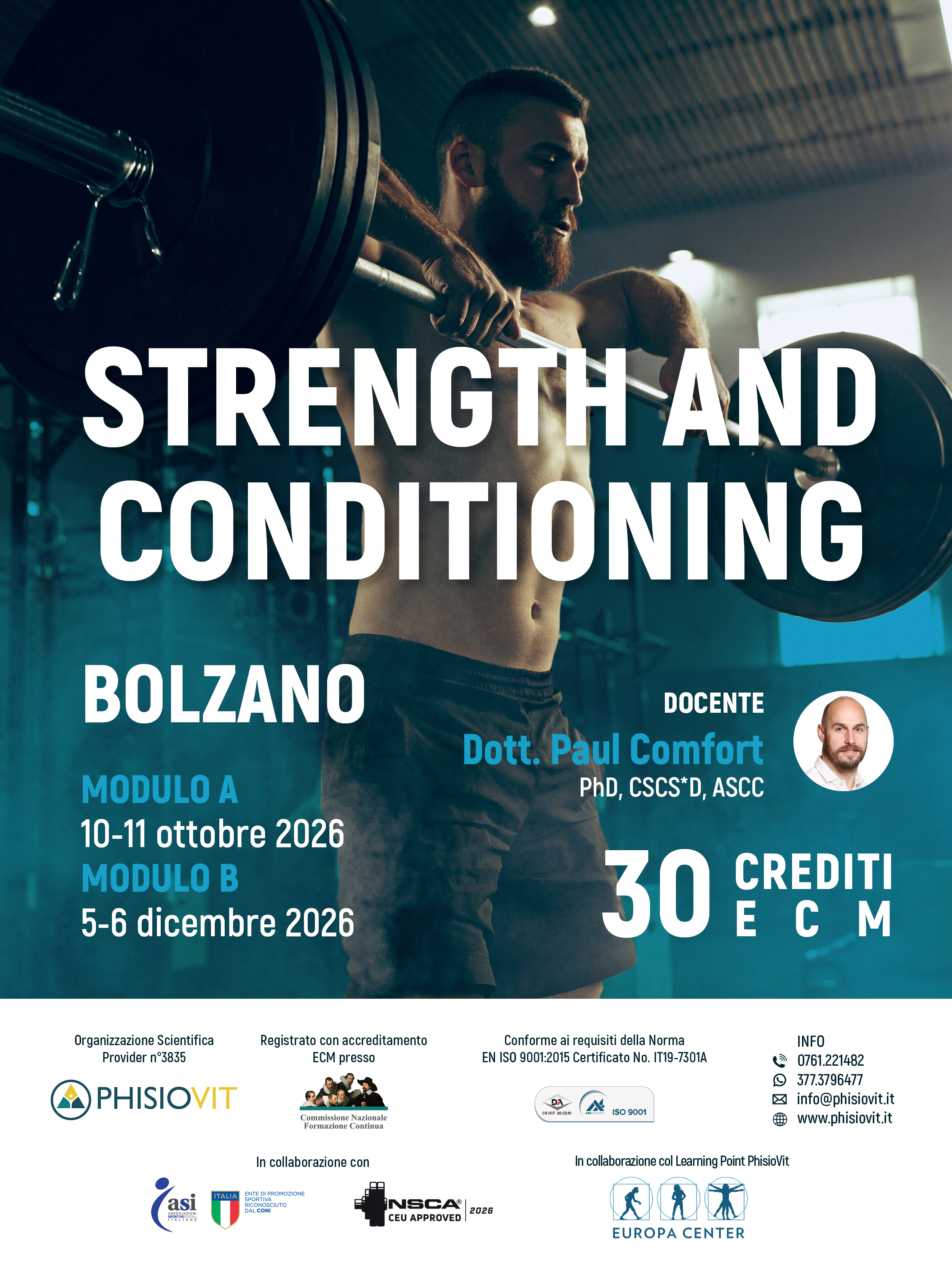 Il corso Strength and Conditioning è composto da due moduli della durata di due giorni ciascuno, per un totale di 30 crediti ECM: